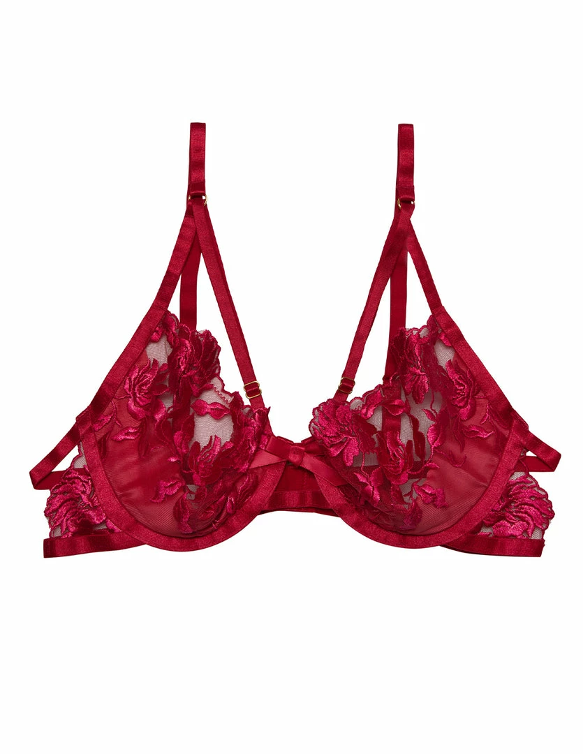 Our HUSTLER Satin Sling Cup Bra has a daring plunging neckline with harness straps. The soft cups are made with floral lace. They have adjustable harness straps. The cups have an underwire. It has double strapped sides, adjustable shoulder straps, and a hook and eye back closure. Pair this bra with our matching HUSTLER Strappy Thong.