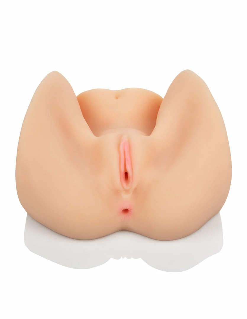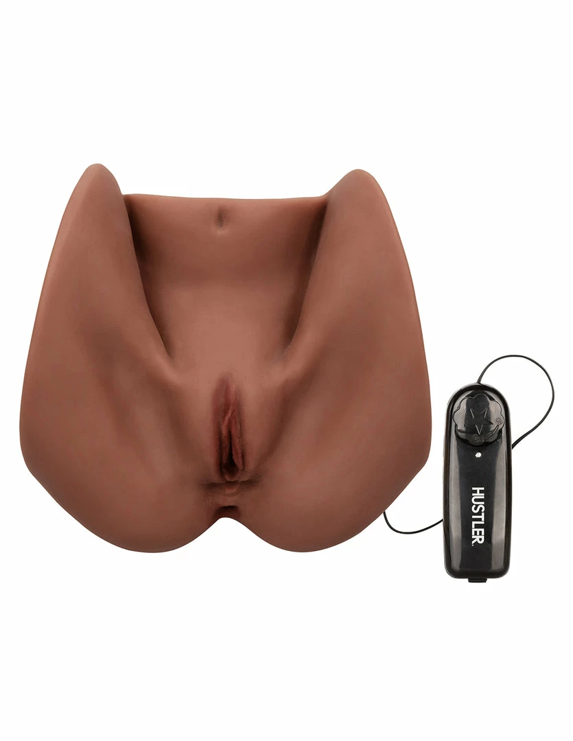 The Vibrating Pussy and Ass Masturbator by HUSTLER® is a small masturbation body form. Imagine her legs bent behind her neck spreading her legs wide open. It is 7 inches long, 7 inches wide, and 3 inches thick. This masturbator has vaginal and anal openings with textured inner linings that will make you want to bust in seconds. A vibrating bullet (included) can be inserted in the opposite opening to enhance this experience. Its multi speed will allow you to fine-tune it to your perfect vibration speed. Lube it up with plenty of water based lubricant. Vibrating bullet requires 2 AA batteries.