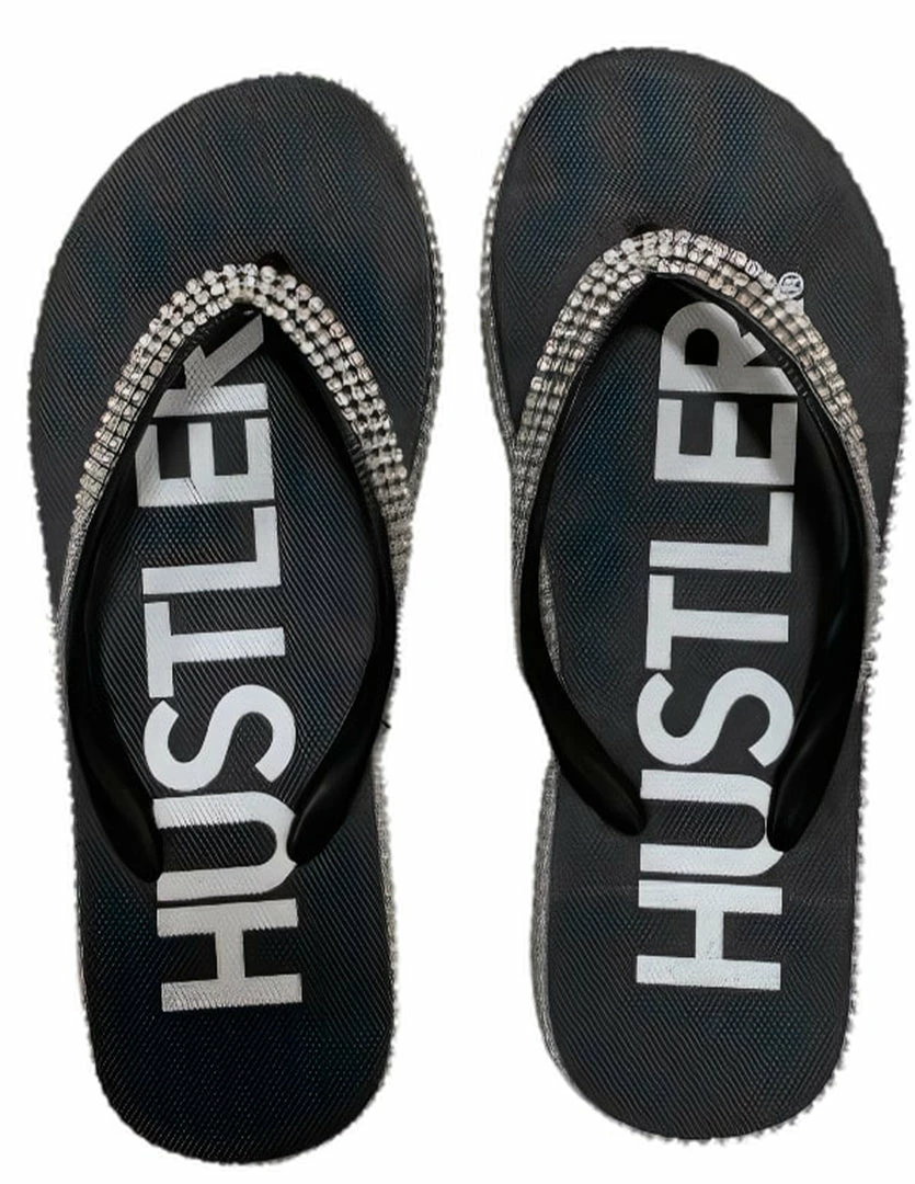 Arrive to your next pool party in our HUSTLER Rhinestone Flip Flops. They are made of soft rubber with our logo across each sandal. Rhinestones decorate the edges around the sandal and the tops of the sandal straps. These sandals flash and shine as the rhinestones catch the light. They are comfortable to wear and eye catching.
