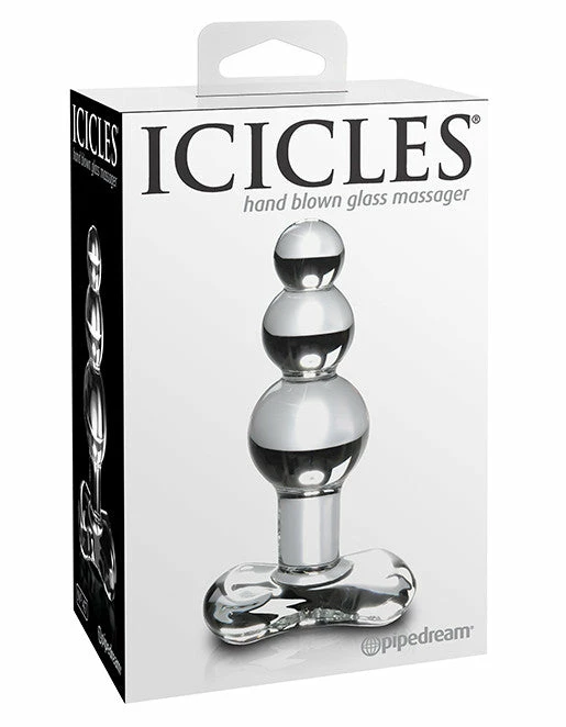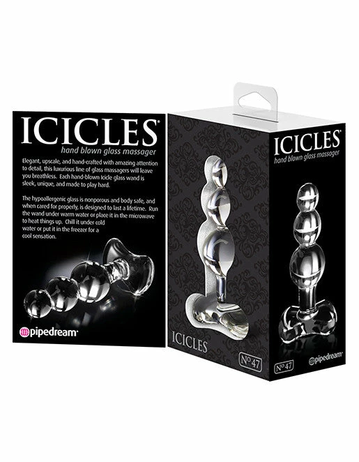 Icicles No.47 is a glass beaded anal plug. It has 3 beads of gradual size. It is 3.5 inches of insertable length, included the neck of the plug. The largest bead is 1 inch wide. This plug is made of Borosilicate glass. It is shatter proof and body safe. The surface of this toy is non-porous. It is hygienic because bacteria can not grow inside of it. The toy can also be boiled to sterilize the surface.