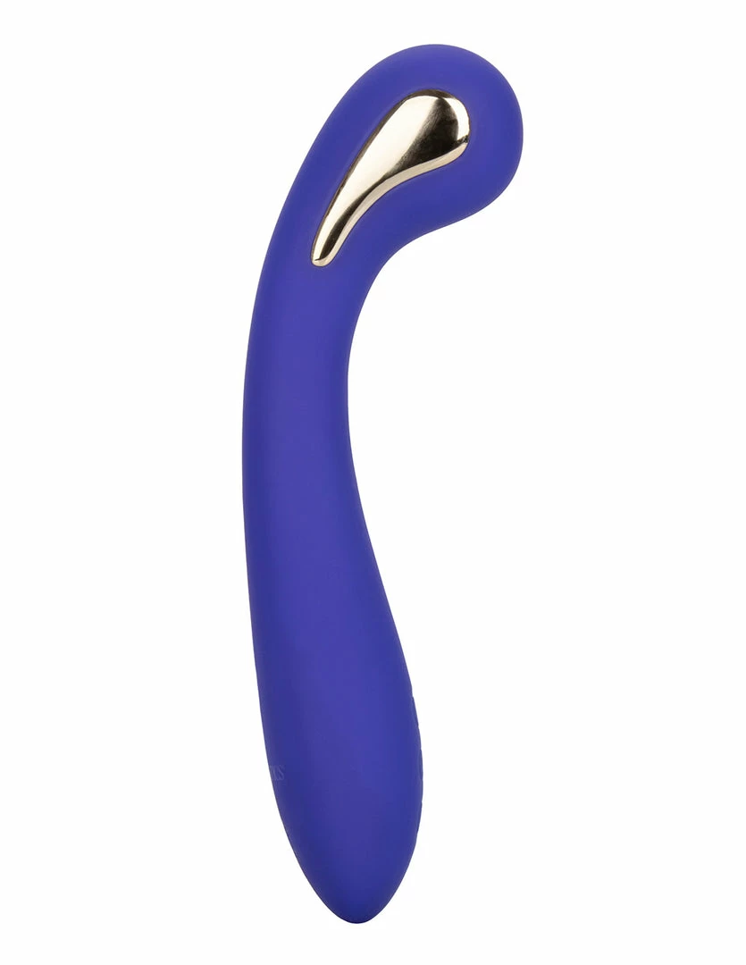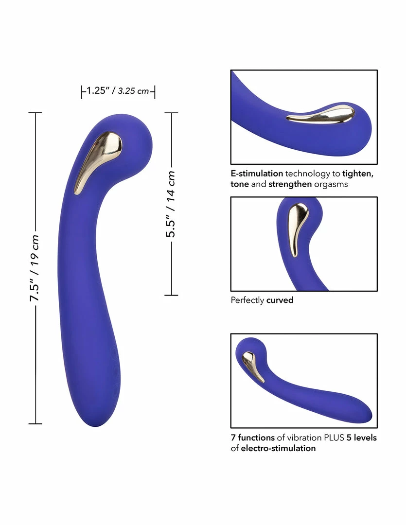 The Intimate E-Stimulator Petite G-Wand by Impulse is a powerful G-spot, E-stim vibrator. Intimate E-Stimulator Petite G-Wand is 7.5 inches long and 1.5 inches wide. It has 5.5 inches of insertable length. This E-stim Petite G-Wand is USB rechargeable and waterproof (E-stim should never be turned on while in the tub or washing). It is made of smooth silicone material and nickel-free alloy.