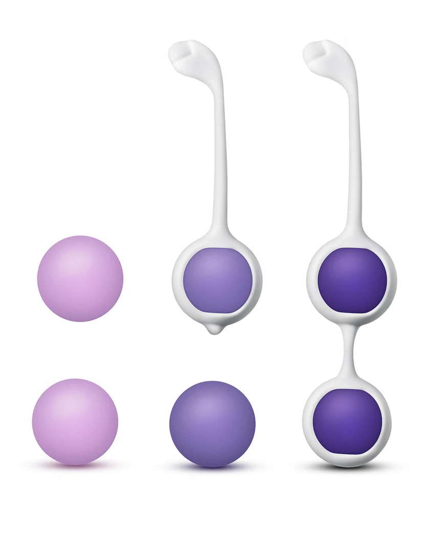 This Wellness Kegel Training Kit comes with 6 Kegel weights and 2 silicone loops. The weights from light to dark are 0.6 ounces, 1.3 ounces, and 1.8 ounces. The Larger 2 ball loop has an insertable length of 3.25 inches. The single ball loop is 1.25 inches wide and insertable length. The tail hangs out with 3 inches of length for easy retrieval.