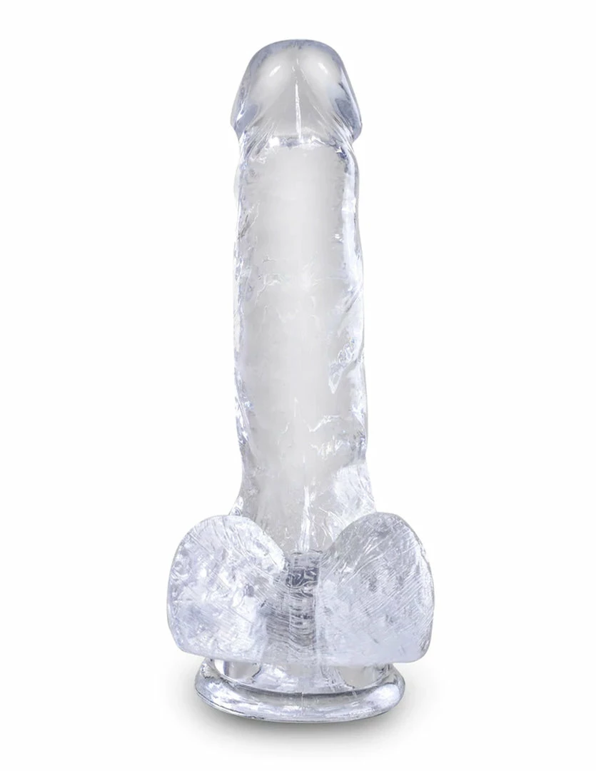 This 6 inch Suction Cup Dildo with Balls by King Cock Clear is exquisitely thick and lengthy. It is 1.5 inches wide and 7 inches long with 5.3 inches of insertable length. This specially crafted formula is virtually odorless, non-sticky, and easy to clean. With its flexible shaft, detailed veins, and defined head, King Cock Clear will engage your senses visually and physically. The powerful suction cup base sticks to nearly any flat surface and makes every dildo harness compatible.