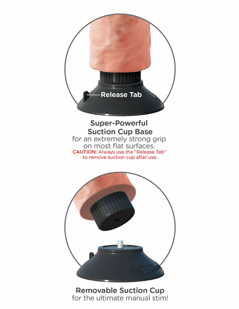 This 6 Inch Vibrating Suction Cup Cock by King Cock is thick and powerful. It is 7.75 inches long, 1.9 inches wide, and has 6.1 inches of insertable length. It is detailed with a wide head, textured veins, and flesh like design. This vibrating dildo is made of PVC material. Bend the dildo however you desire. It is sturdy with a suction cup base. Stick it on the shower wall for a hands free experience. The vibration speed is adjustable. Its suction cup base also makes this vibrator harness compatible. It is fully waterproof and can be enjoyed in the shower or tub. Lube up with plenty of your favorite water based lubricant.