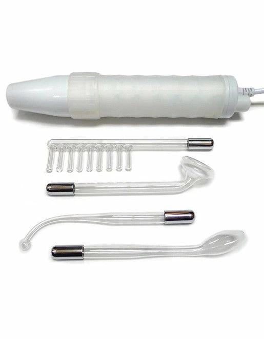 The wand is perfect for beginner to advanced users. This kit comes with 4 attachments: electrode comb, mushroom tube, 90 degree probe, and tongue tube. It delivers mild to intense electrical taps.