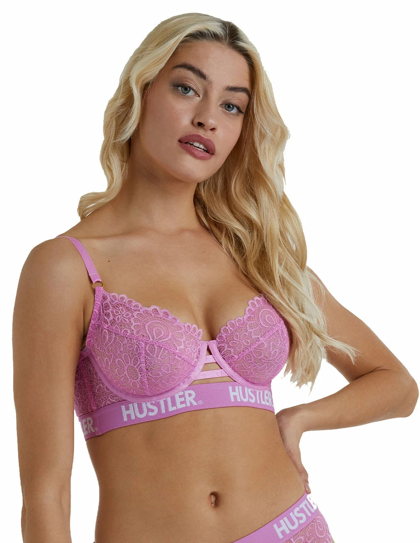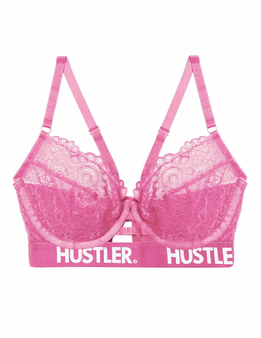 Our HUSTLER® Logo Elastic Band Lace Bras are comfortable and sexy. The soft cups have shape enhancing lining with underwire. It has cute keyhole opening details on the front and back. The base of the bra has a thick elastic band with our official HUSTLER® logo. Adjust the shoulder straps to your comfort. The bra closes on the back with a hook and eye closure. Pair this bra with our HUSTLER® Logo Elastic Lace Thong to complete the set.