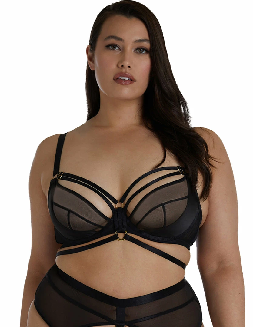 Our HUSTLER® Mesh & Satin Gold Ring Bra Curve will give you the sexy boost that you need. It comes in sizes 38B to 42 G. This bra is strappy with mesh and satin material. This bra’s design lifts and enhances your cleavage. It has double breast harness straps that add extra appeal to your cleavage and an underbust strap that contours an hourglass figure. It has classy gold colored hardware. This bra’s straps are adjustable and has a hook and eye back closure.