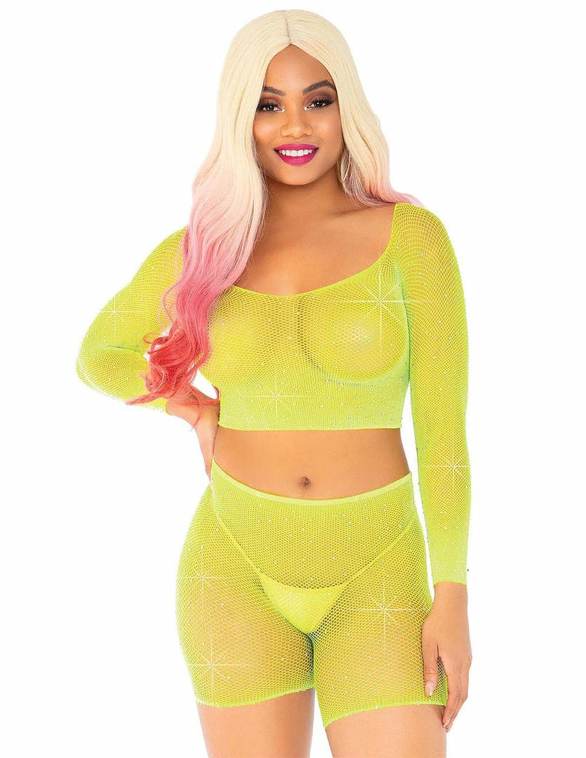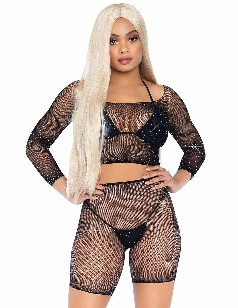 Feel festival glamorous in this 2 piece set. Covered in rhinestones, this Leg Avenue fishnet crop top and fishnet biker short set will mesmerize your viewers. It is comfortable to wear. This set is ideal to wear over your favorite bra and panty set, and the rhinestone shimmer will catch the lights in any venue, just right.
