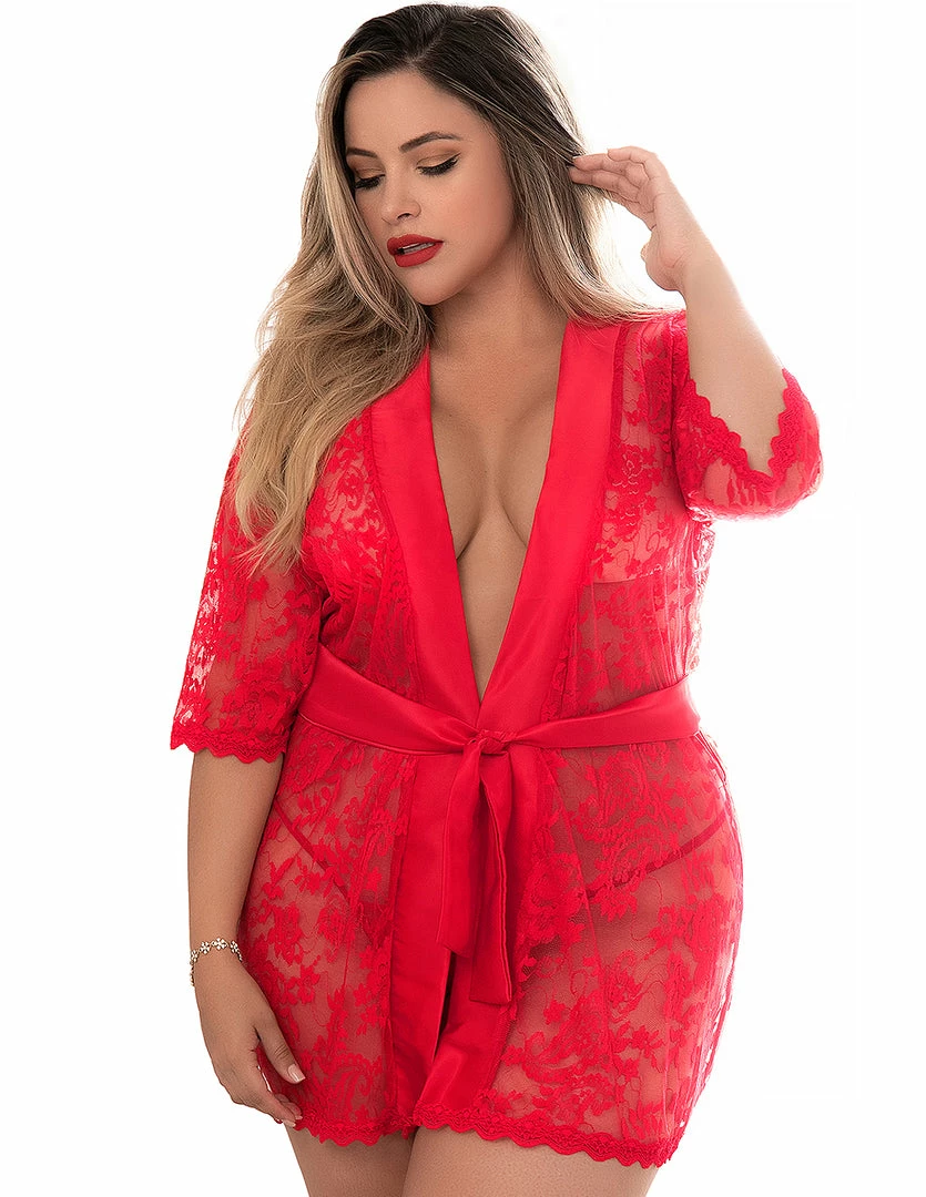 Allover lace robe with satin trim and tie waistband. Elbow length sleeves features scalloped lace trim. Includes matching g string. This robe is perfect as a tease for what’s to come over sexy lingerie, or nothing at all.