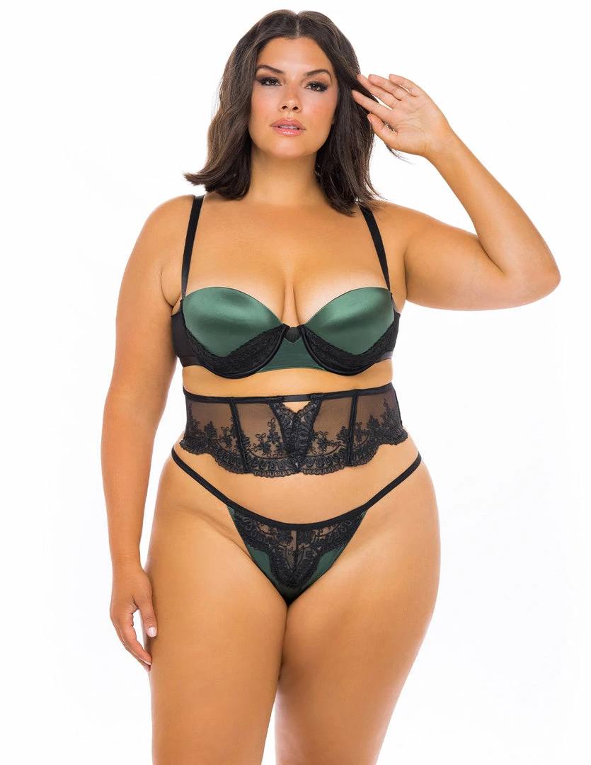 The Paulette Cincer Set by Oh La La Cheri comes with a molded cup bra, embroidered lace cincher, and bikini panty. This set contours and enhances a hour glass figure. Its satin cups and embroidered lace design are made with quality materials. Find your inner seductress with the Paulette Cincher Set.