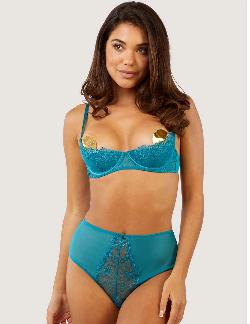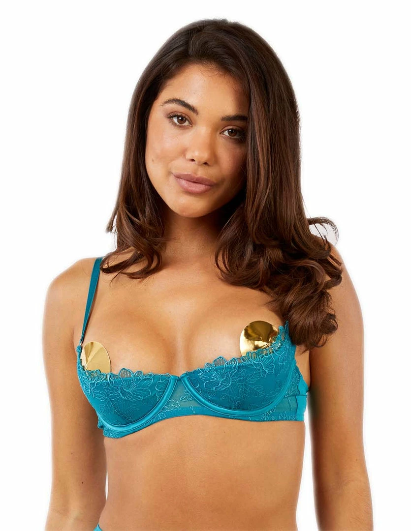 To add into your collection of summery intimates is the Playful Promises Marsha Shelf Bra. This open cup bra will add support and show off your chest. The lace is cut perfectly to hold up your breasts with the underwire. It features hook eye closures and adjustable straps to assure the perfect fit.
