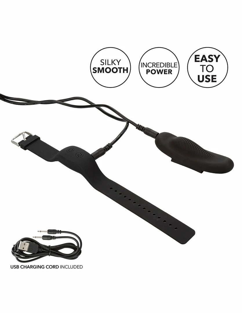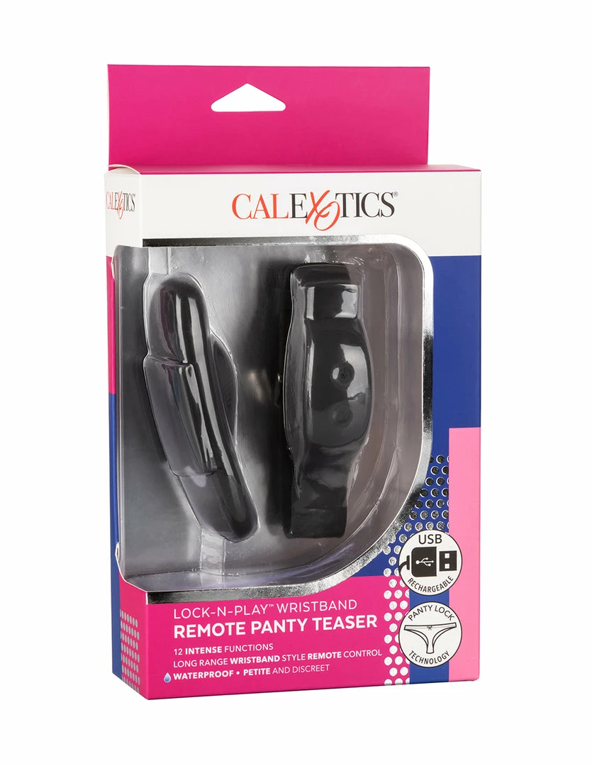 This Wristband Remote Panty Teaser by Lock N Play is a discreet way to enhance foreplay outside of the bedroom. The panty vibrator has lock-in-place magnets that keeps it anchored on the panty. It is 3.75 inches long and 1 inch wide. Its wristband remote is 9.25 inches long and adjustable. It is made of silicone, a hygienic and non-porous material. The vibrator is USB rechargeable and waterproof. It can be controlled from up to 32.75 feet. It has powerful, deep, and buzzy vibrations with 12 vibrating patterns and speeds to play with. Use a dab of water based lubricant on the textured side of the panty vibrator for best results.