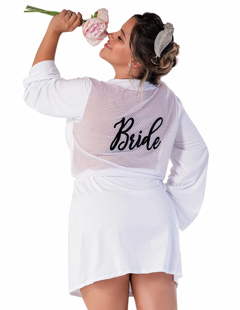 This soft, short robe will many any blushing bride feel extra special. “Bride” is printed on the back on sheer mesh material. This robe comes with a matching g-string. It ties closed at the front with a detachable tie belt.