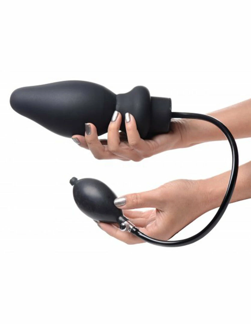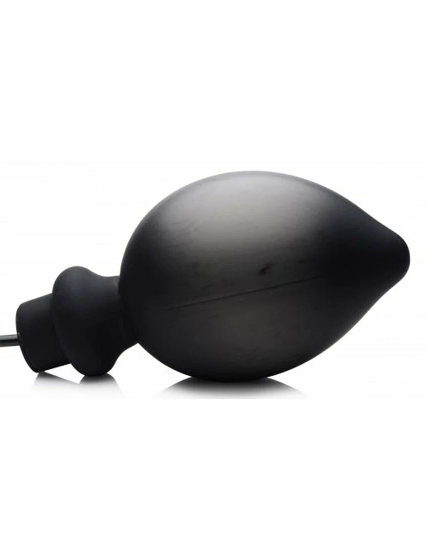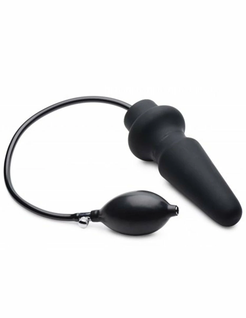 The Master Series Ass-Pand Inflatable Plug is for experienced anal toy users who love a great stretch. This inflatable plug is 7.8 inches long, 2.1 inches wide, and 5 inches of insertable length with a 1.8 inches wide neck. Inflated it has a 3.3 inch diameter. This device is a total of 26 inches long. It is made of silicone with latex inflating bulb, PVC inner core, and copper air valve.