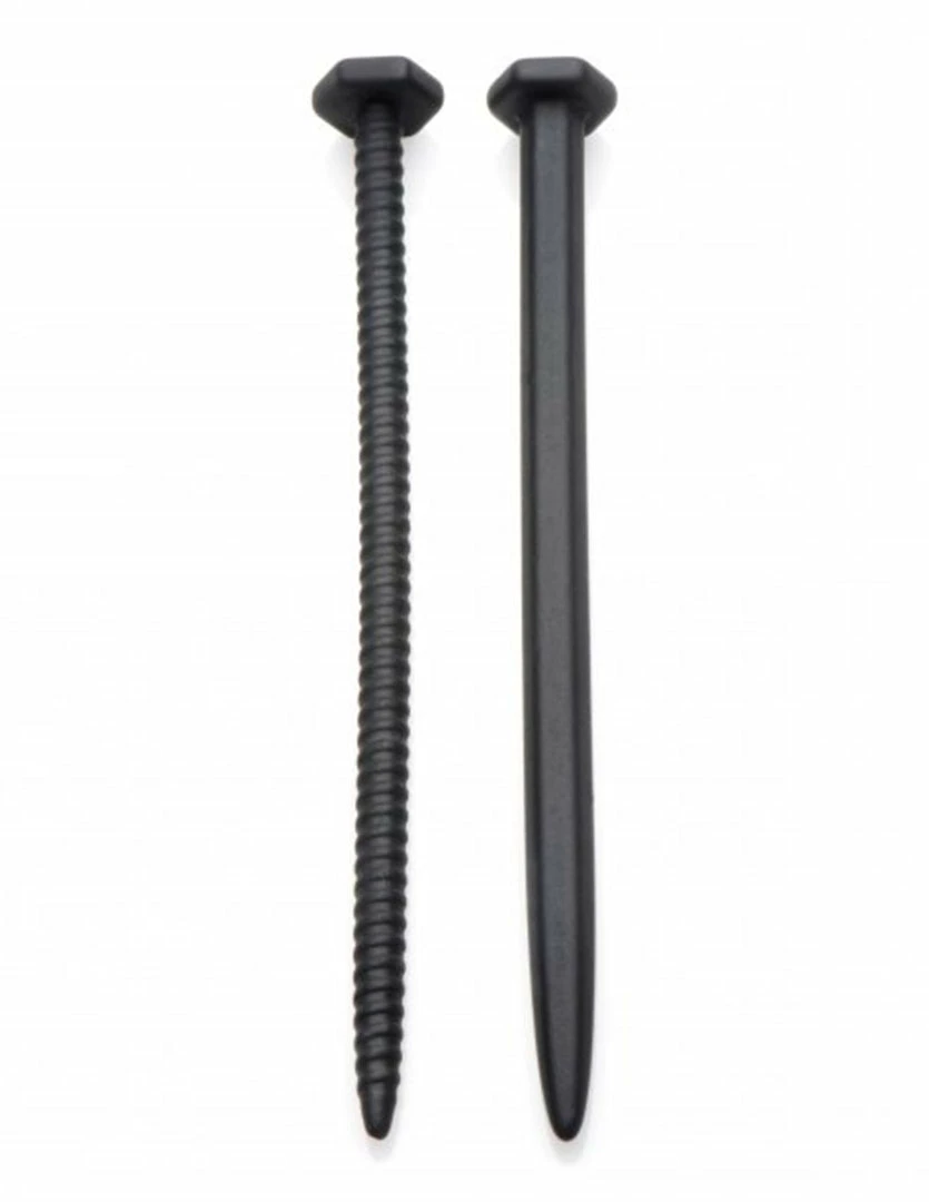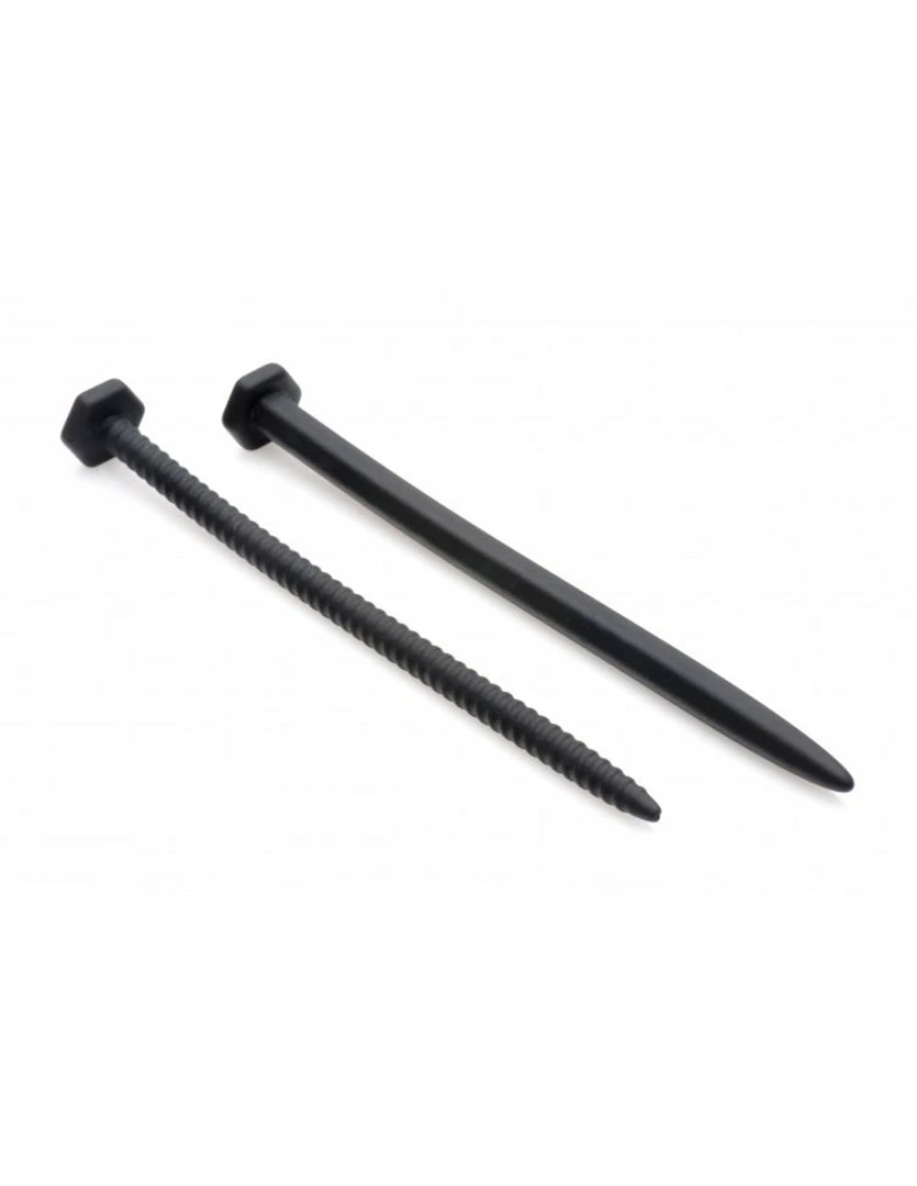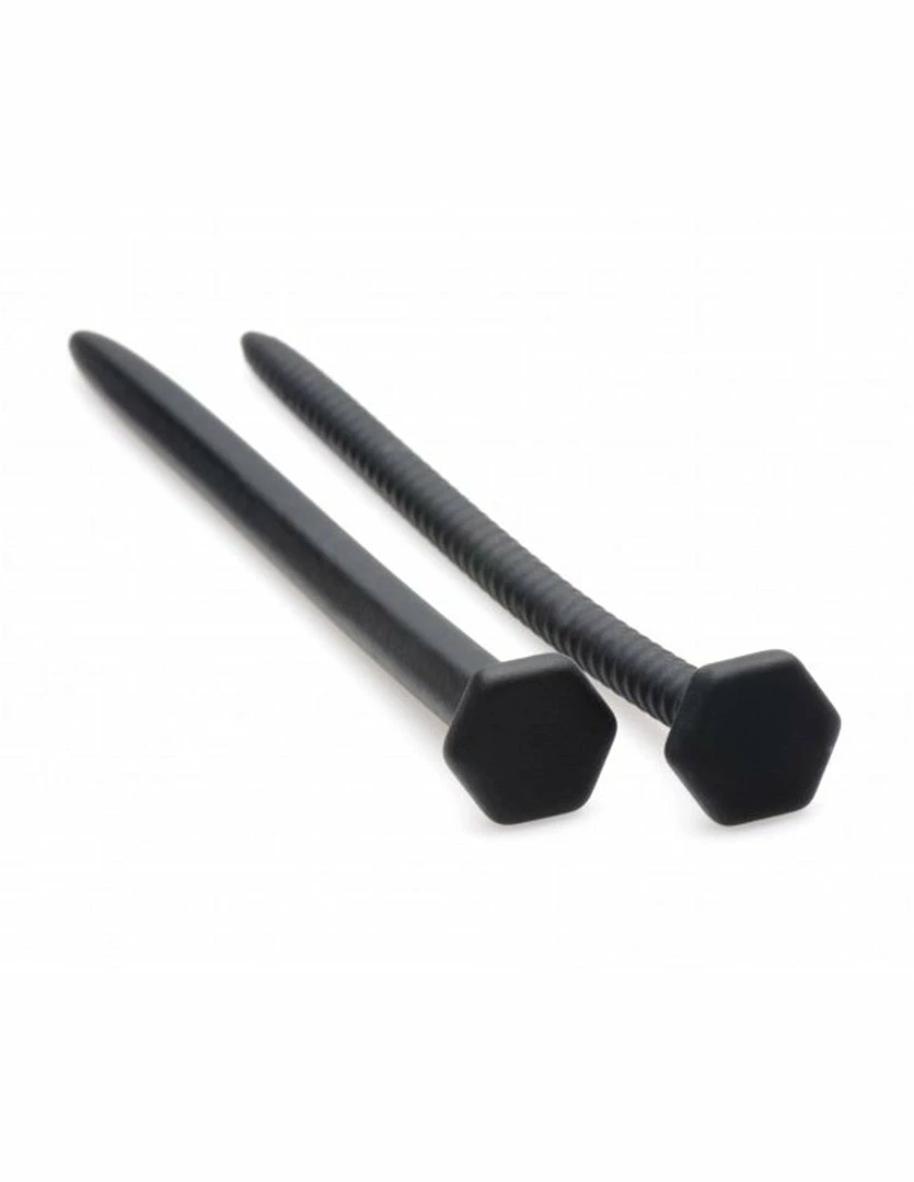 These Hardware Nail & Screw Sounds by Master Series are the perfect way for experienced sounding enthusiasts to explore texture. This kit comes with 2 pieces, one smooth hexagonal nail and a spiral-textured screw. Each rod is 6 inches long with a 0.3 inch wide nail and 0.2 inch wide screw. Both sounding rods are made from a silky silicone so they are flexible and soft. They are hypoallergenic and very easy to clean.