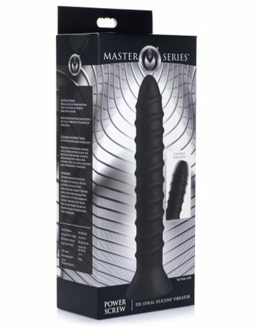 Get ready for the Power Screw 10X by Master Series. It is 8 inches long and 1.4 inches wide with 7 inches of insertable length. It is made of Phthaltes free silicone and ABS plastic. The tip is tapered for ease of insertion. A spiral swirl goes down the shaft to add texture to this vibrator. Every thrust of this vibrator will massage the vaginal or anal muscles internally. The texture bumps up against the g-spot or p-spot. It has 3 increasing speeds and 7 vibration patterns to play with. Combined, texture and vibration will make your sessions even more pleasurable. This toy is USB rechargeable and IPX6 waterproof. It is compatible with only water based lubricants. Fully charge the toy before using it.