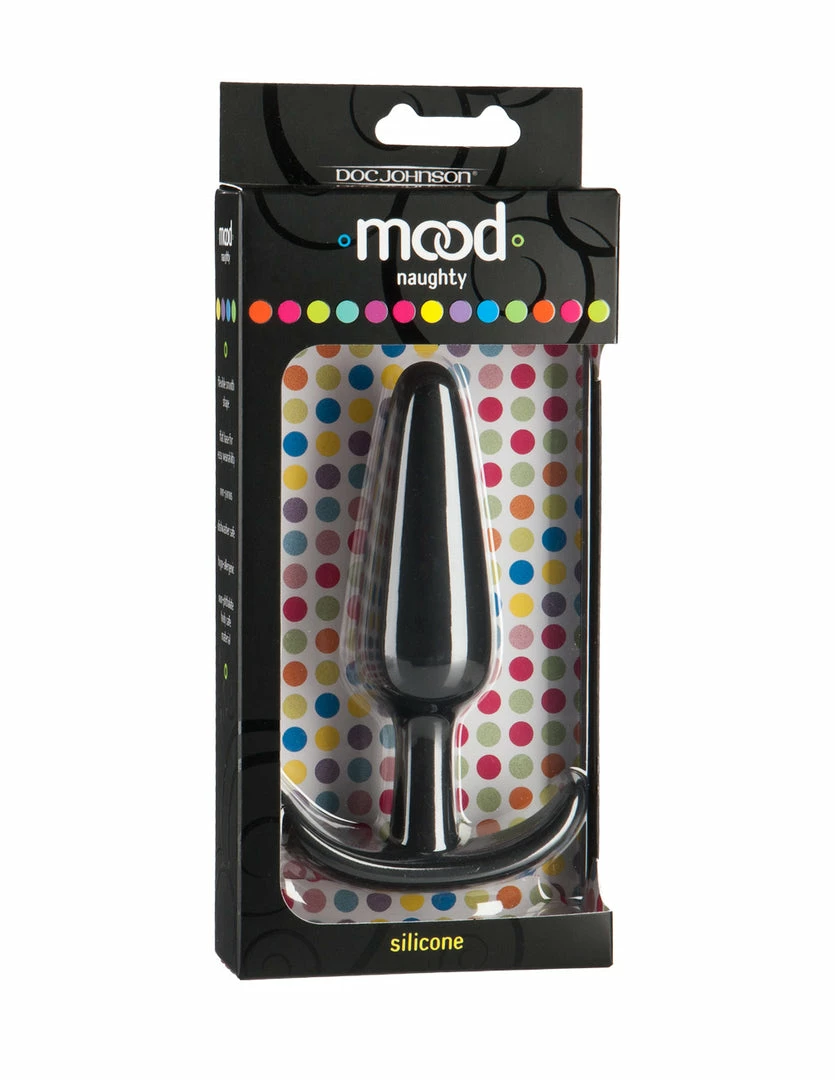 This Naughty Large Silicone Anal Plug by Mood is the perfect plug for experimenting anal play. Play with your new sex toy regardless of your experience level because this anal plug is tapered and 4.9 inches long. Ease it in by positioning it against the anus and pushing it back and forth to ease it in. It is made of solid silicone material. Insert up to 4.5 inches length and 1.3 inches width. This plug is best used with water based lubricants. Its flared base keeps the plug from going all the way in. It makes it easy for retrieval and sits between the cheeks comfortably. This plug can be worn during sex or during solo masturbation.