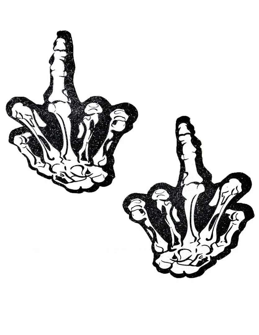 You don’t have to throw up your middle finger because these skull hands will do it for you. The Middle Finger Skeleton Hand Pasties by Neva Nude are bad ass. They are made of swimsuit material with latex-free adhesive. These skull hand pasties are waterproof. Wear them in place of a bikini top, under a sheer top, or by themselves under a cute blazer for a wild night out. Neva Nude pasties are great for pool parties, concerts, rave events and more! These pasties are 2.75 inches long and 2.5 inches wide.