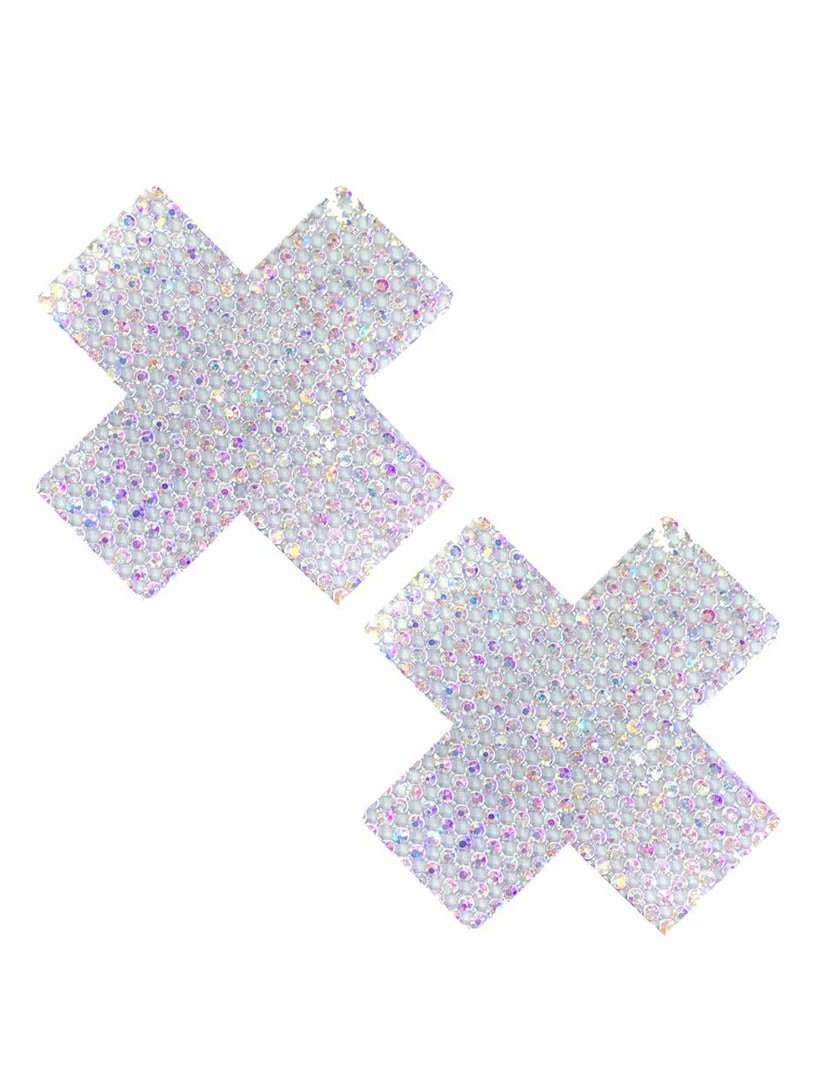 These Rhinestone Jewel X Pasties are iridescent and exude sparkling unicorn magic. They add a dazzling effect to your nipples. These pasties are 3.5 inches by 4.5 inches long. They have latex free, medical grade adhesive backings. These pasties are waterproof, sweatproof, and party-proof. They stay on for up to 24 hours when applied correctly. Wear these stunning pasties with your favorite outfits, sheer mesh net tops, leather jacket, or bikini bottoms. These pasties are festival friendly and give you the nipple coverage you need, whenever you need them.
