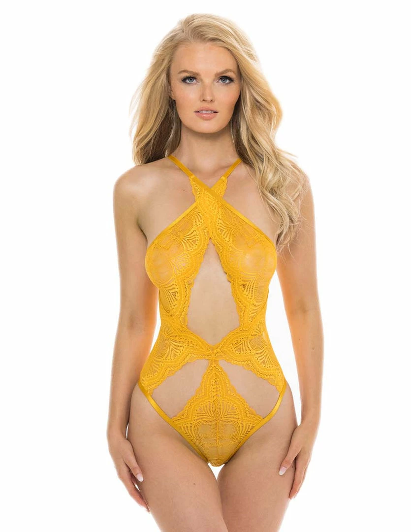 Something chic and versatile is the Oh La La Cheri Blisse Teddy. This simply sexy teddy is made out of a stretchy and dainty floral lace with elastic straps. It features a halter neckline with a large waist keyhole. This keyhole is reflected with more cut outs which will all show off little peeks of skin. Your booty will also be showed off as well with it’s front to back exposed crotch. A ribbon tie is found at the back to assure a snug and secure fit as well as adjustable straps.