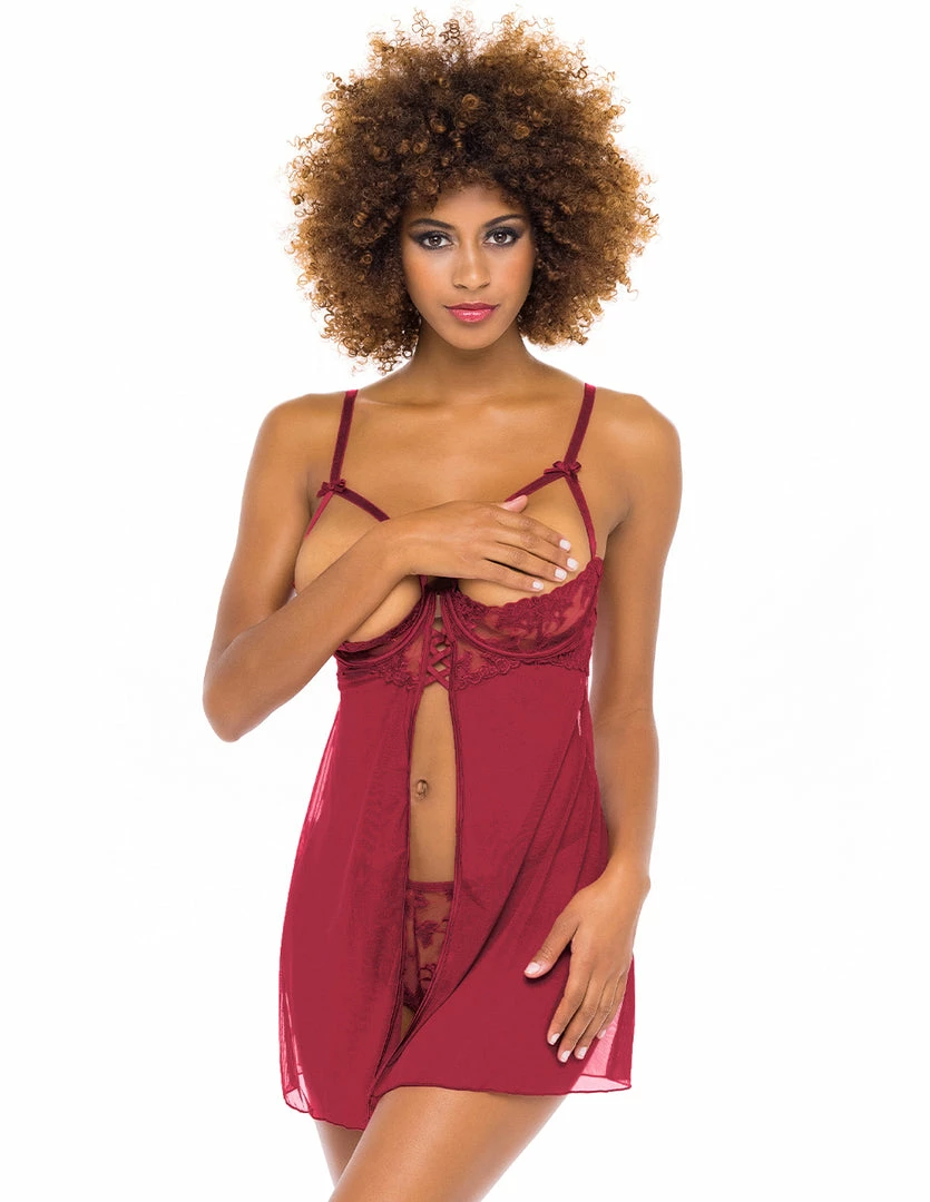 The Kira Babydoll by Oh La La Cheri is seductive with its open cups and open front design. Its sheer skirt flows around the body. The open cups have embroidered shelf cups that lift the breasts. Open cups give easy access for you or your partner. The back has a plunging open key hole with lace up detailing. This babydoll comes with a matching G-string.