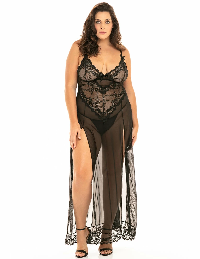 The Valentine Gown by Oh La La Cheri elegantly silhouettes your curves and has thigh high slits that reveal sexy legs. The top bodice has soft with triangle tops that gently lift your cleavage. Its material is made of sheer stretched lace. It is lined with scalloped lace and decorated with bow accents at the center and the top each cup. The straps adjust for your comfort.