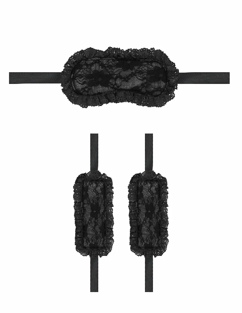 This Introduction Bondage Kit #7 by OUCH! includes a satin lace blindfold and satin lace wrist restraints. Tease and seduce your lover into submission. Tie them up and blind fold them. Their senses will be heightened with every kiss and touch.