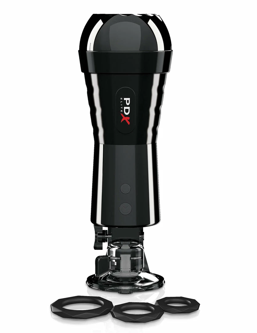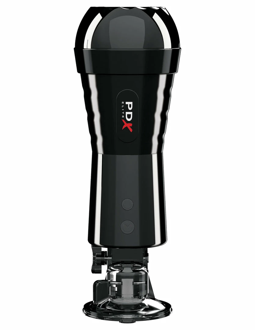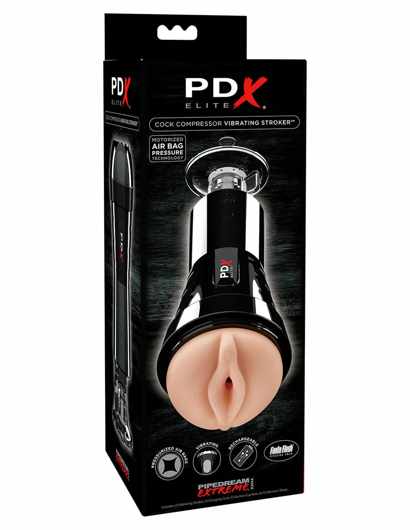 PDX ELITE creates high quality products at an affordable cost. The Cock Compressor Vibrating Stroker is seriously a stroke of genius! It is 9.2 inches long and 3.4 inches wide. It has 8.5 inches of insertable length. The sleeve is made out of Fanta Flesh material that feels real to touch. It warms to your touch. It stretches and its textures feel amazing. This sleeve creates a suction as you thrust into it. This stroker is USB rechargeable. It has incredible vibration, press the vibration button once to turn it on. Click through the vibration button to cycle through its many patterns. Hold down the vibration button to turn off vibration.