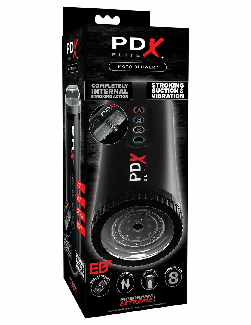 The Moto Blower by PDX Elite is a light weight, motorized masturbator. It is 8.9 inches long, 3.5 inches wide, and has 5.5 inches of insertable length. Its casing is made of ABS plastic material and has a TPR sleeve. It is USB rechargeable. This masturbator has 3 independent buttons for vibration, thrusting, and suction.