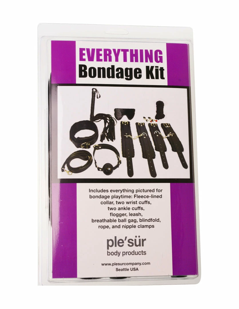 Indulge in your kinky fantasies any time you want –– no planning required with this ready to play all-in-one 12 piece Everything Bondage Kit! No matter what shade your bondage fantasy is, this kit has all you need to fulfill it. This kit comes with faux fur lined hand and ankle cuffs, faux fur collar and leash, nipple clamps, breathable ball gag, mini flogger, and bondage rope, and faux fur lined mask.