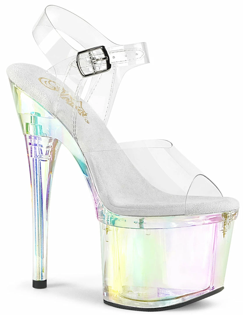 Be the prism in these sexy Pleaser Esteem 708RBP. These are peep toe platform sandal heels. The PVC straps keep your feet and ankles secure as the peep toe keeps it airy and breathable. The towering 7 inch heel is tapered for a sexier look. The 3″ platform gives you comfort. The insole is a bouncy microfiber so feel free to walk in. The iridescent finish of the heel change finishes off so perfectly in the light. Look for the prism that not only stand out but stands tall.