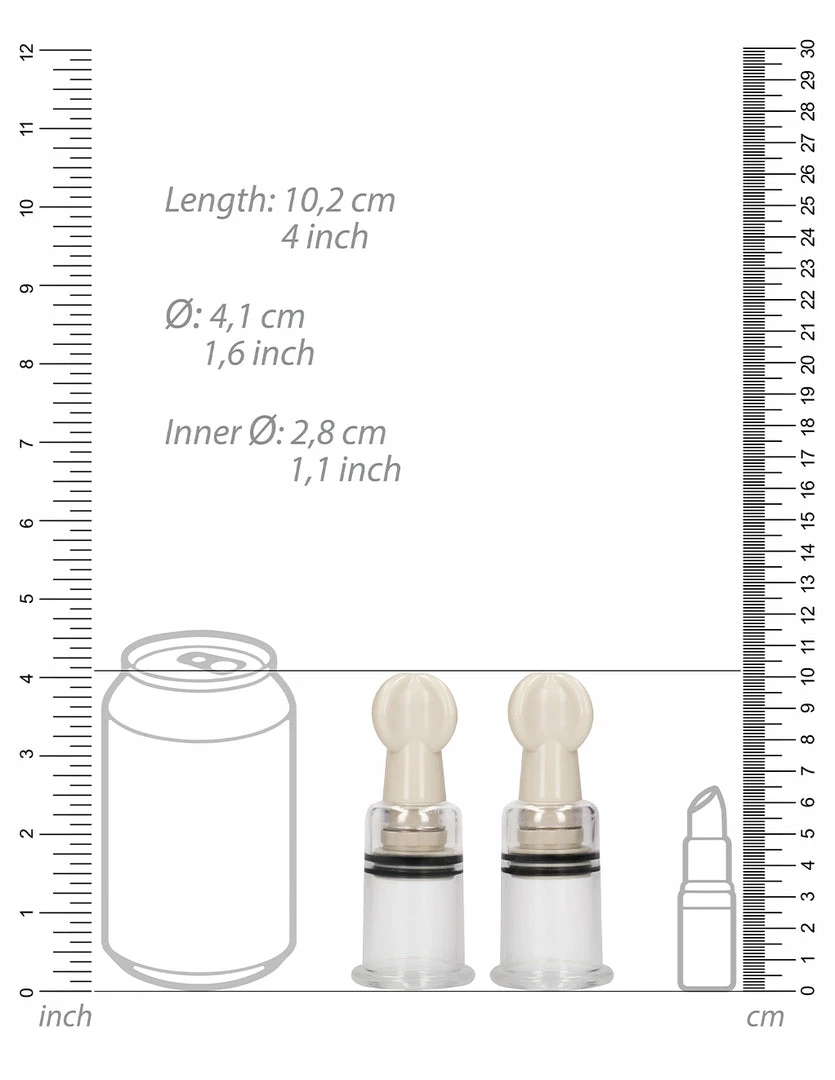 These Nipple Suction Cups by Pumped will elongate, stimulate, and make your nipples sensitive. They draw blood forward, filling the erect nipple. Its increased pressure in the area stimulates your nerve endings. Once released, the nipples are sensitive to touch. These cups are great before or during sex, or even just to tease your nipples. It comes in 3 sizes to choose from: small, medium, or large. They are made with ABS plastic. The small is 1.1 inches wide. The medium is 1.6 inches wide. The large is 2 inches wide. Choose the cups that are wider than your nipple to leave space for suction.