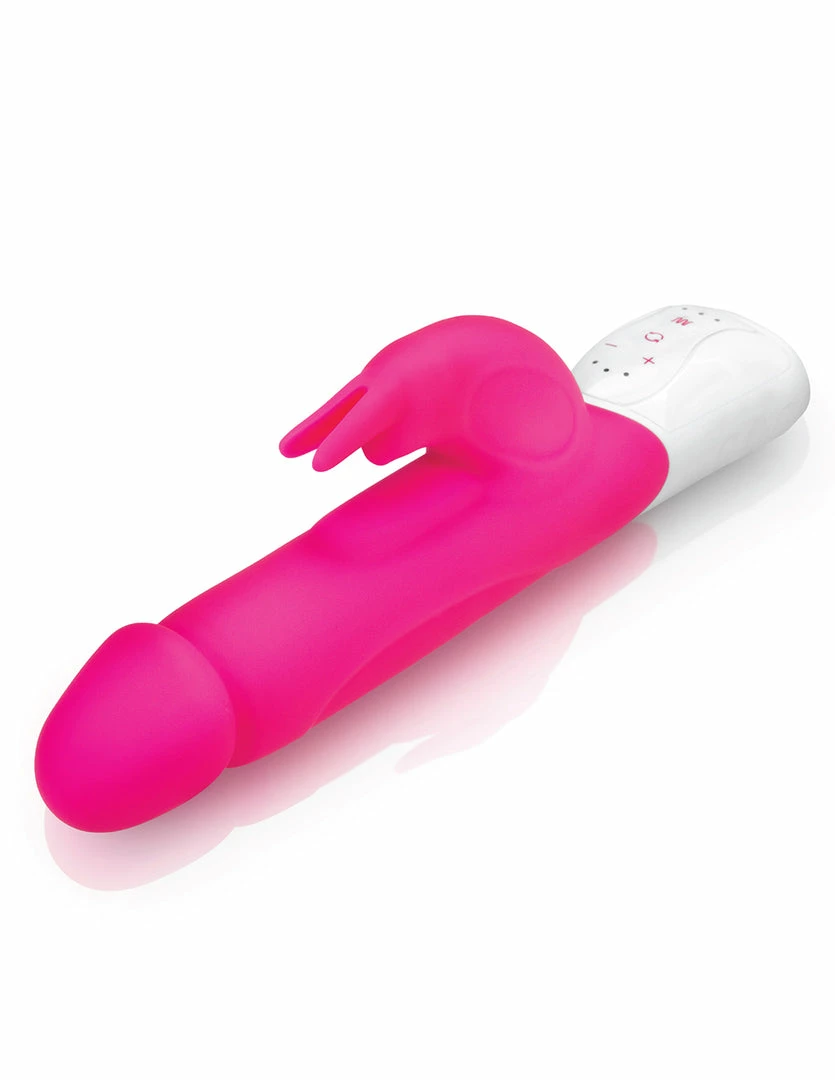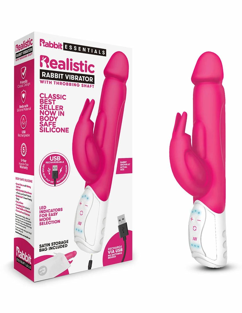This Realistic Rabbit by Rabbit Essentials is a dual stimulating vibrator. It is made of smooth silicone material. This vibrator is 10.2 inches long, 3.2 inches wide, and has 4.9 inches of insertable length. It is USB rechargeable and splash proof. Its control pad has LED lighting. Play with 7 speeds and vibrations.