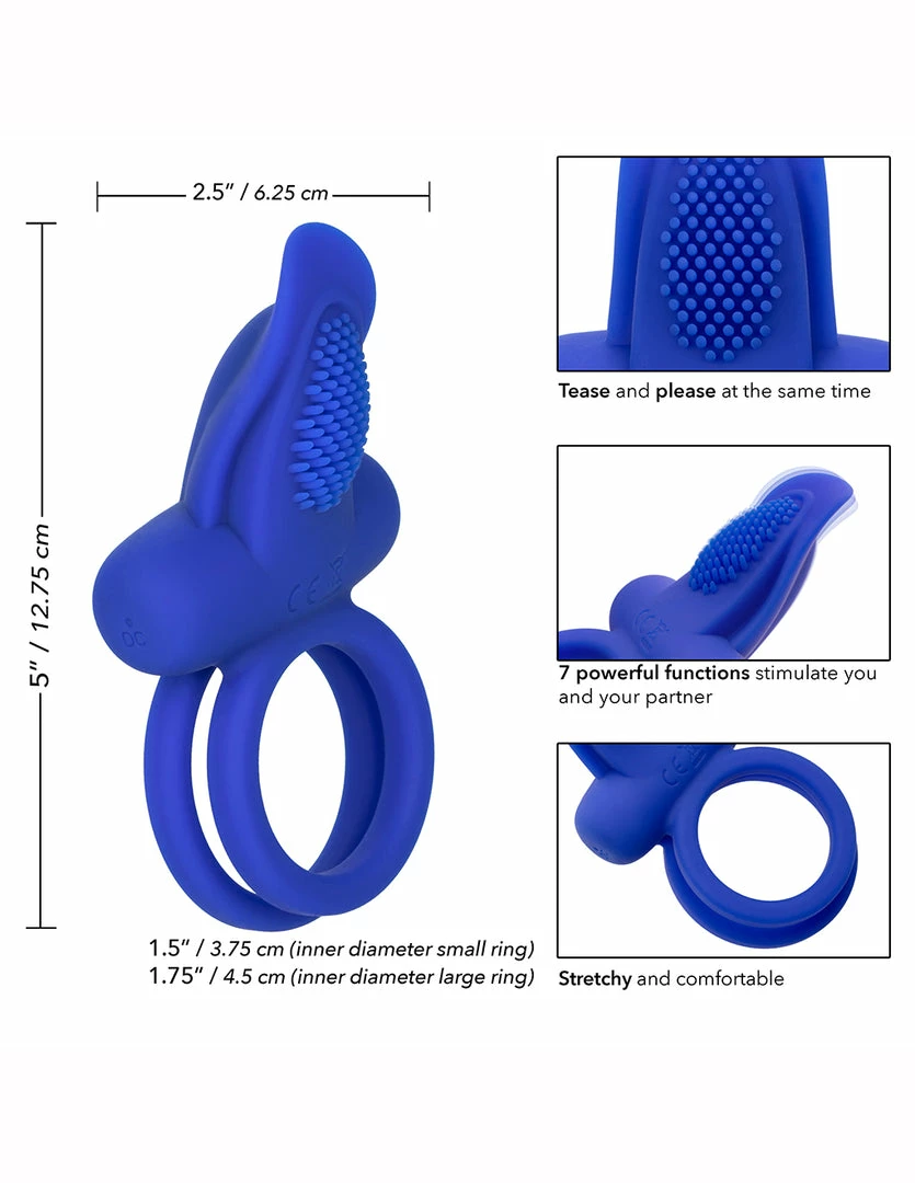 The Dual Pleaser Enhancer by CalExotics is a vibrating ball and cock cockring. It is 5 inches long and 2.5 inches wide. The smaller ring has a 1.5 inch diameter. The larger ring has a 2.5 inch diameter. It is made of medical grade silicone. It is USB rechargeable and 100% waterproof. This vibrating cockring has 7 vibration patterns to enjoy. It has a function memory chip so you can start from the last vibration setting it was on.