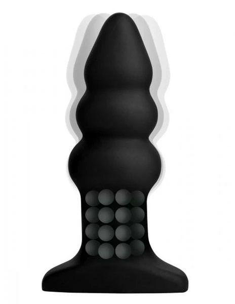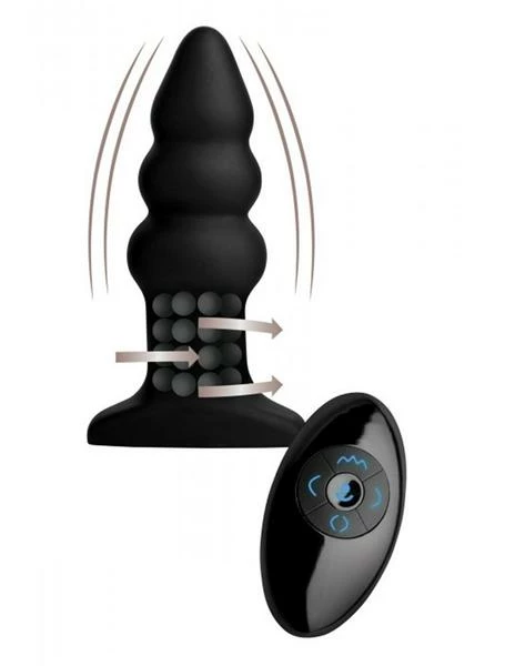 This Rippled rimming Plug with Wireless Remote by Model I is a smooth, firm, silicone butt plug. Its rotating metal beads at the base of the plug allows the wearer to experience a rimming sensation by massaging the opening of the anus. There is also a vibrating motor in the tip of the plug with multiple speeds to add the perfect amount of vibration to your anal play.