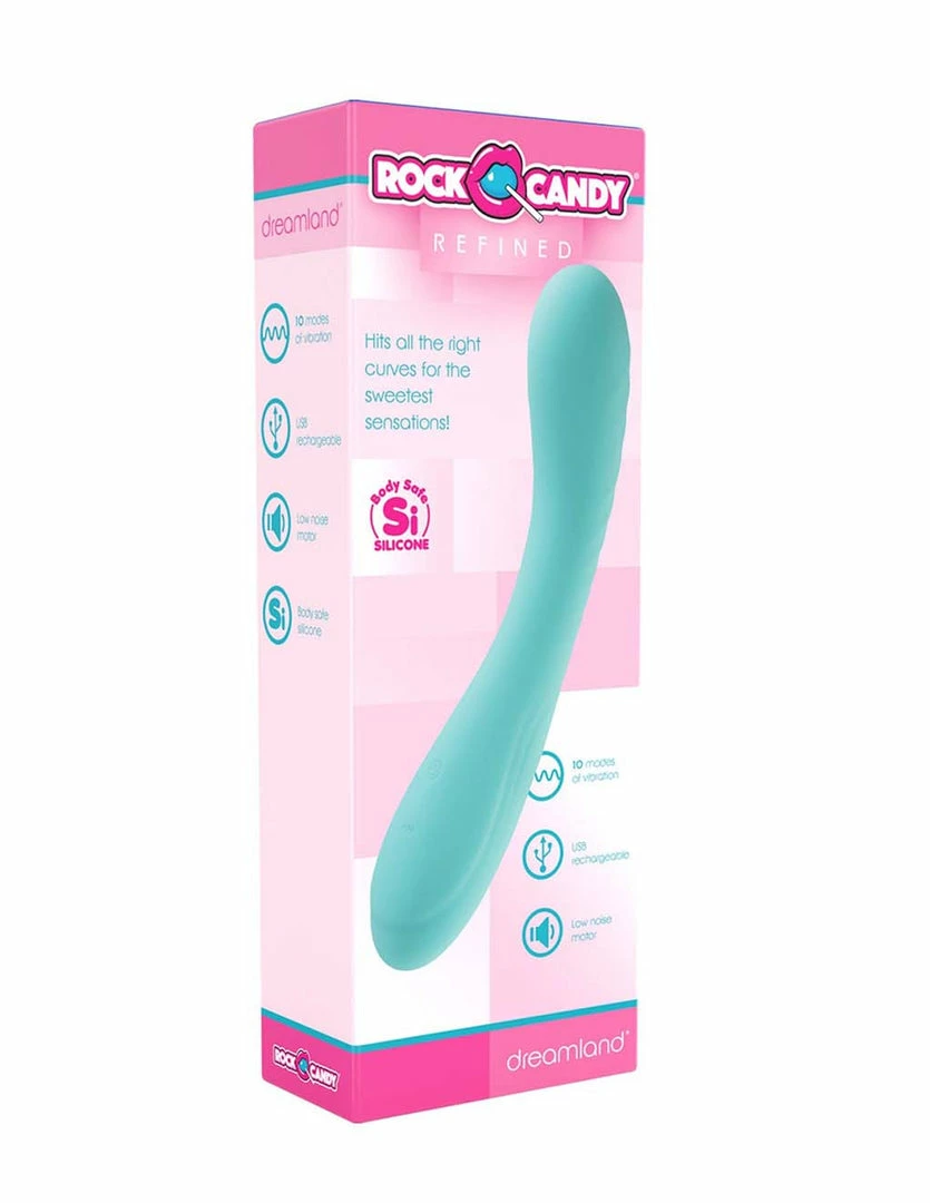 Get into the sweet seduction that is the Rock Candy Dreamland. This aims to please and stimulate the g spot. The curved shaft is ergonomically designed and understands the natural curvature of your body to get up right in there to give you sweet pleasure. The soft silicone texture is body safe and splash proof ideal for shower play. Enjoy the 10 rumbling modes of vibration. As you discover the vibrations tingling, experience the soft and subtle ribbed slopes along the shaft gripping along your pleasure points. There is a USB charging cable included in the kit for on the go convenience. Escape into the Dreamland by Rock Candy to give you a sweet sensation.