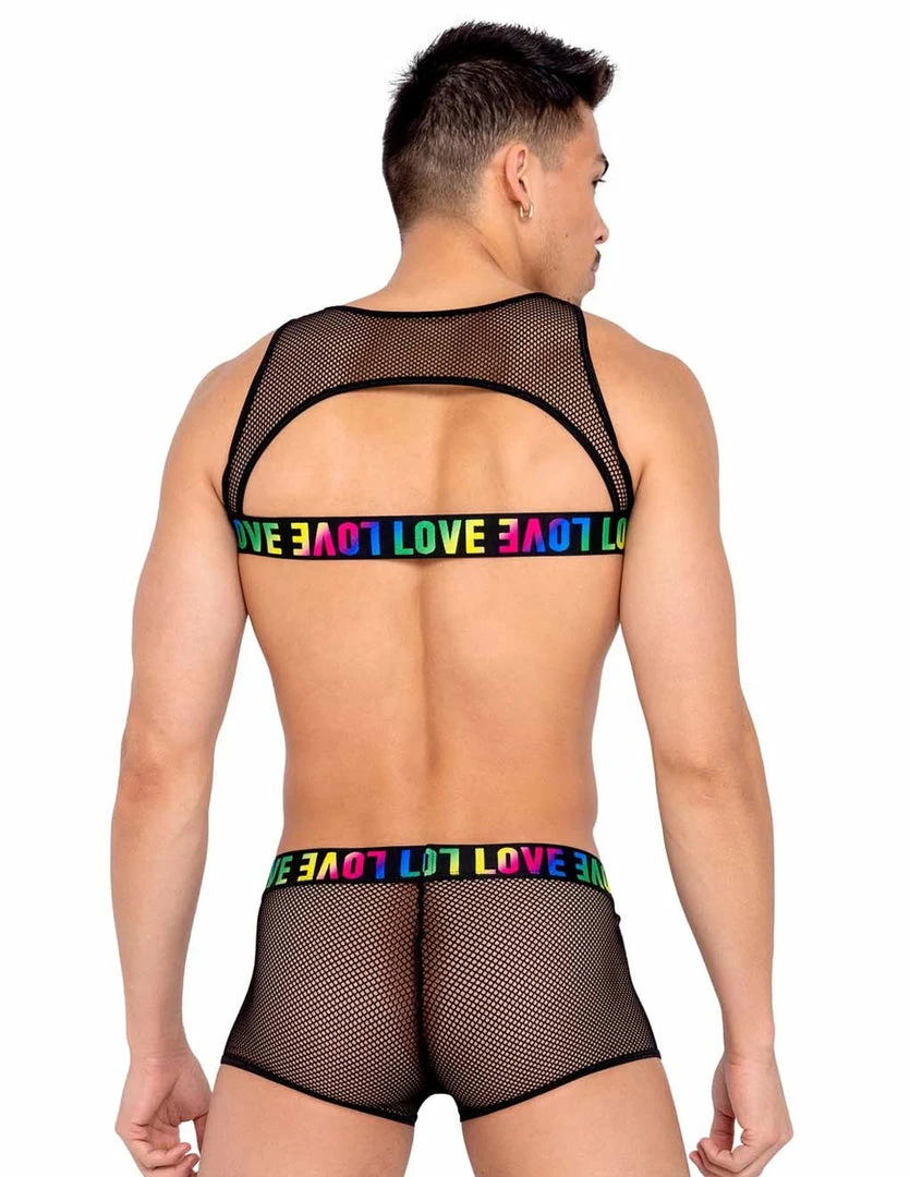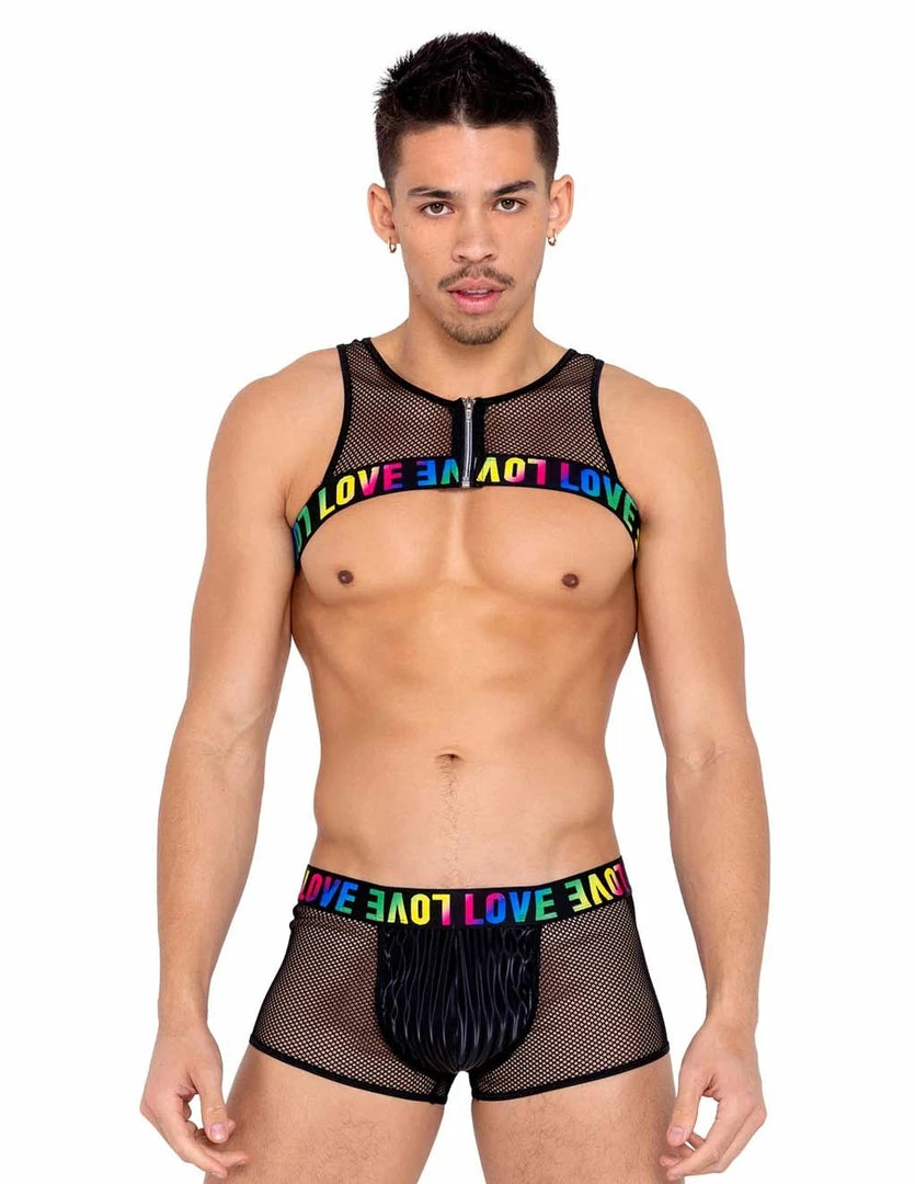 For a prideful peepshow for go the Men’s Pride Fishnet LOVE Trunks. These trunks are made of a stretchy mesh fabric. The colorful elastic band sits right along your hip showing off your torso. There is a front panel that covers the crotch. Wear this for your Pride season events or whenever you’re feeling festive.