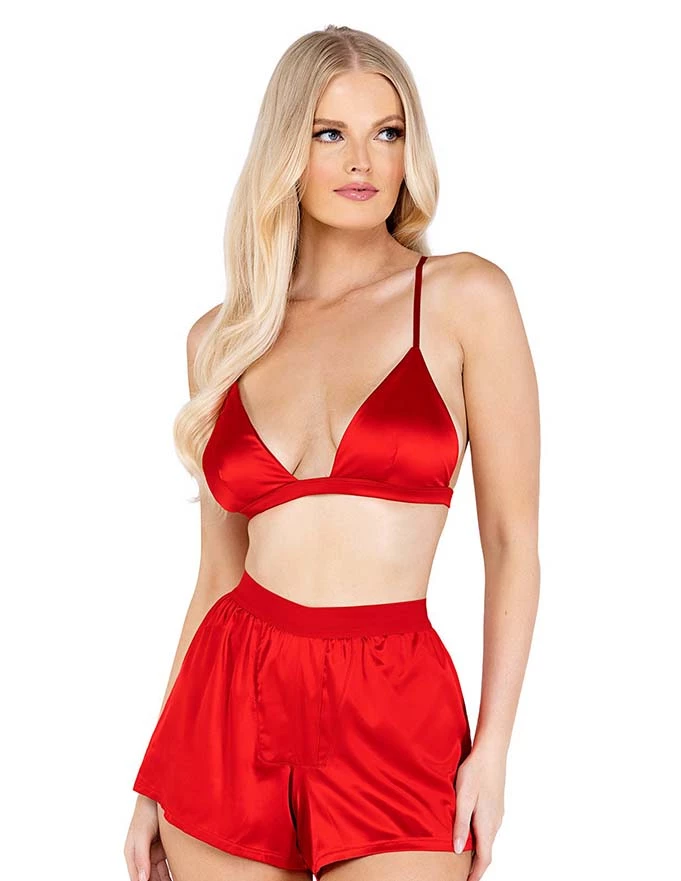 Need something to wear while you lounging around for bae? Or what if you need something to just chill around in while looking hot? Go for the Roma Satin Shorts Lounge Set. This two piece set comes with a bra top and booty shorts. The bra top is made of a soft satin with adjustable straps and center darts to hold the breasts up. The shorts are simple pull overs that would typically be pulled up the waist. This satin set is perfect for just lounging around and serves as another sexy outfit to show off your body in.