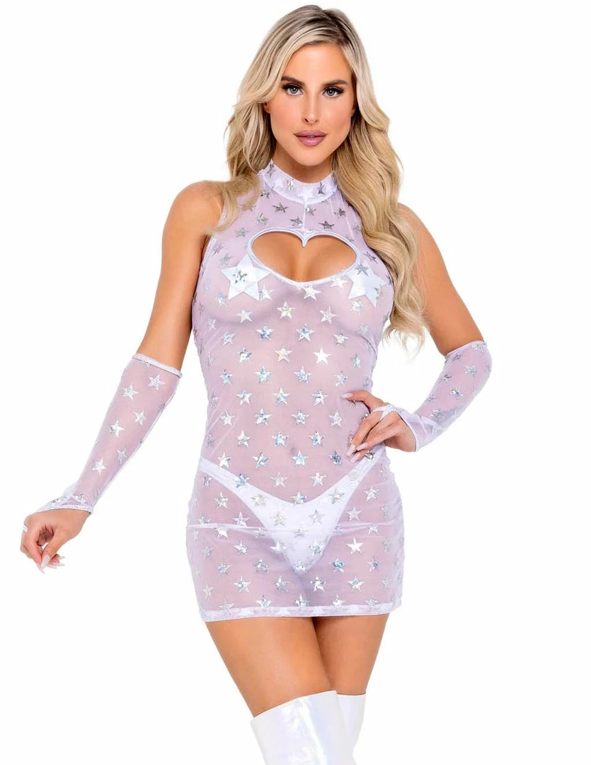 Look like the ultimate crush in the Roma Stars Dress with Heart Cutout. This eye catching dress is made of stretchy and comfortable mesh fabric adorned with metallic stars. The stars capture the light and reflect with every move you have in store for the night. With the choice of colors, you can coordinate with your friends. get your heart on in the Roma Stars Dress.