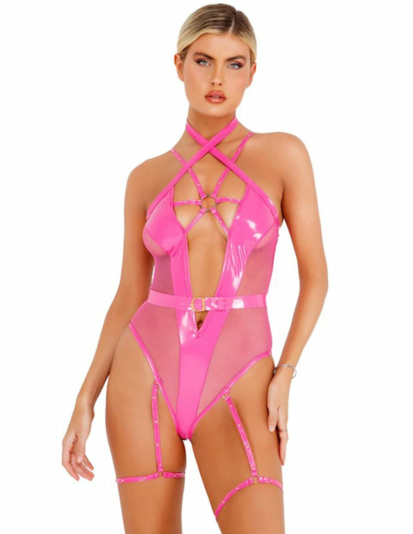 This Strappy Vinyl Bodysuit by Roma flaunts all your curves in the most seductive fashion. This bodysuit has straps that line along the upper bodice and crosses at the front of the neck, hooking together on the back. Its shoulder straps link at the ring detail at the front and connect to the back. The shoulder straps are studded. The front is connected by a ring detail. It holds the shoulder and bra straps together. The upper bodice is made of vinyl that has a multiple cutouts revealing cleavage and a deep neck lining. The sides of this bodice are made of sheer mesh with a vinyl belt cinching the mid-section. Detachable leg garters connect to the front of this bodysuit. They are studded with a ring detail at the center. Add accessories with stockings and high heels to create the sexiest outfit with this bodysuit.