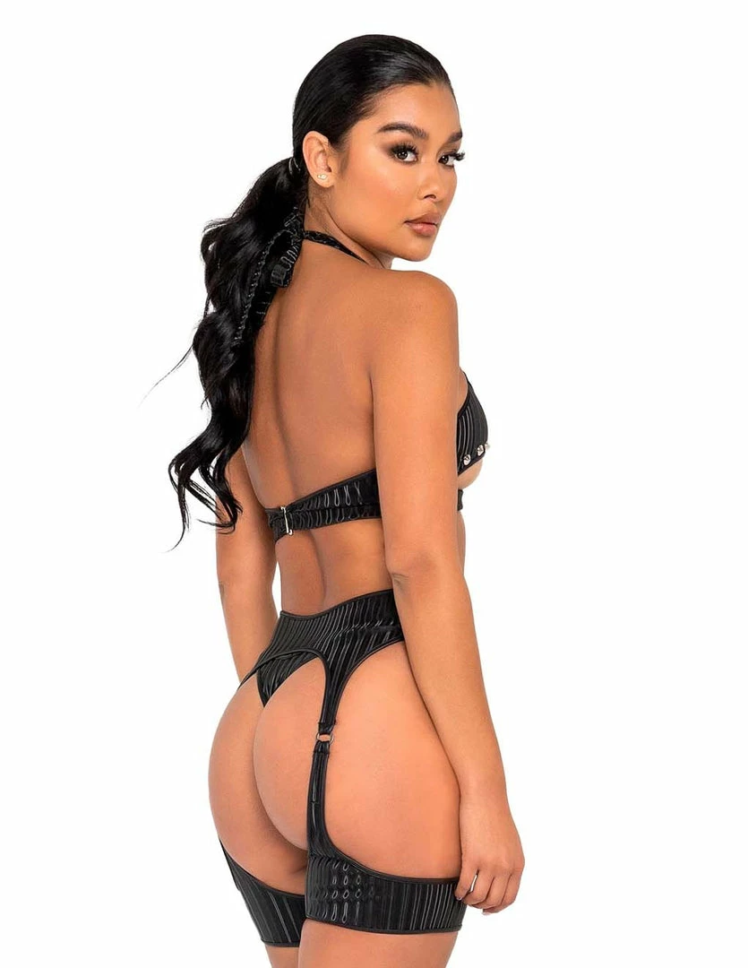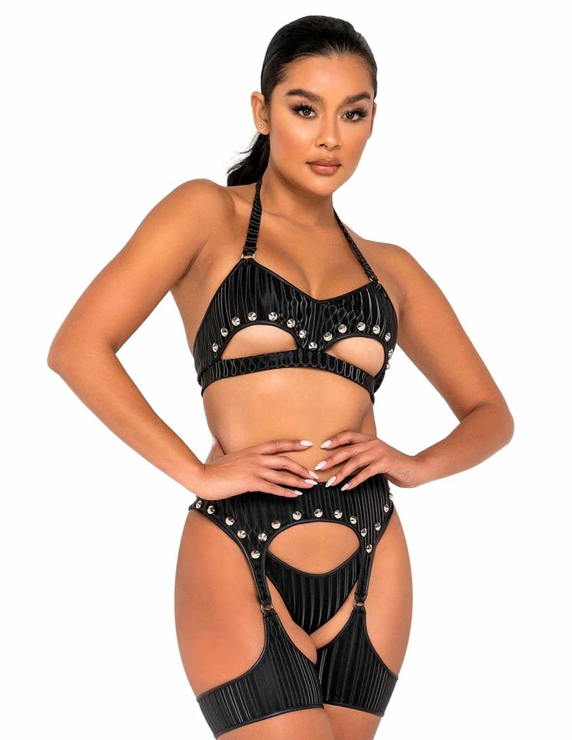 Roma Studded Garter Belt Harness adds a chapped western flare to your festival look. You can add it along to the Roma Thong Back Bottom and the Roma Studded Underboob Cutout Top, or use it with any other outfit you may have on hand. This garterbelt hangs from your waist as the straps expose your hips, thighs, and booty.