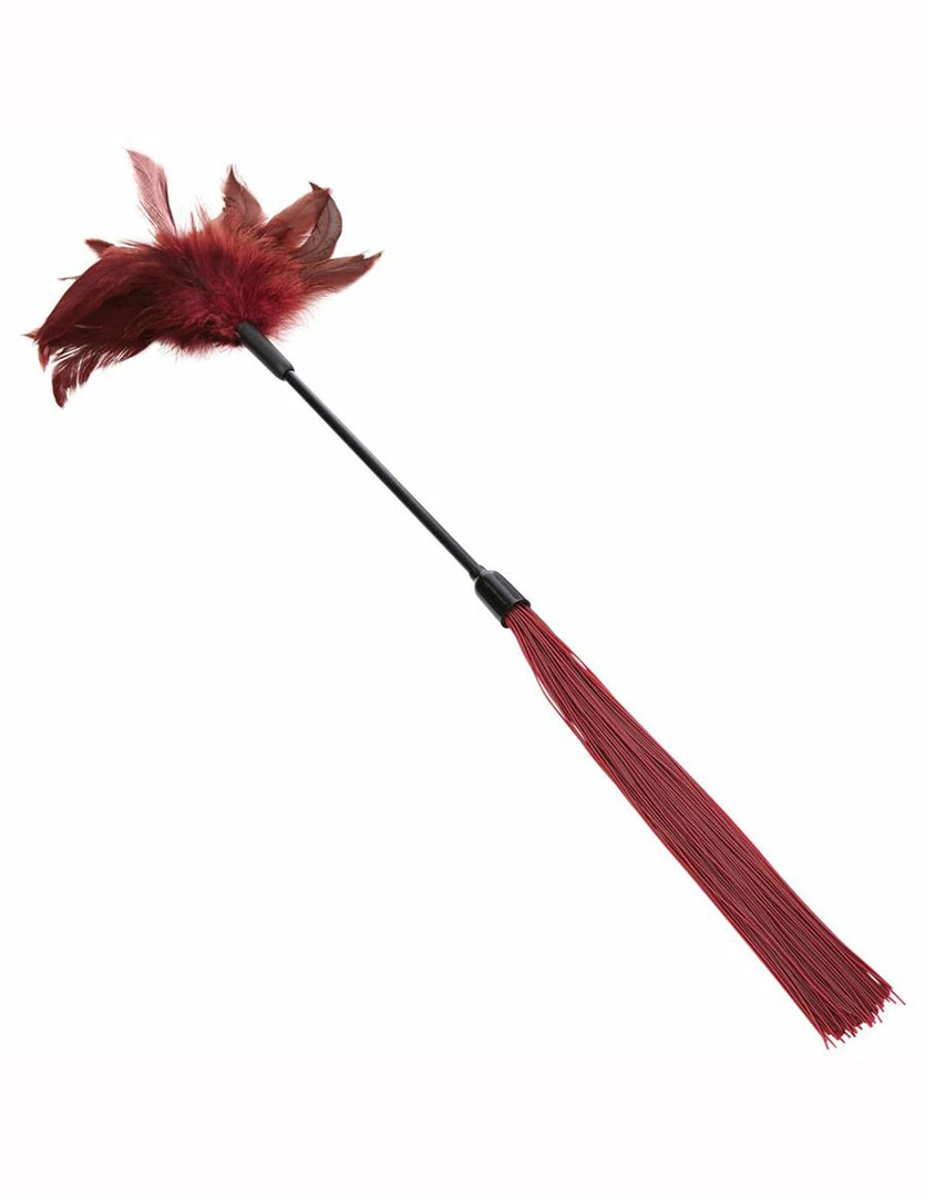 The Enchanted Feather Tickler is a two sided, bedroom motivator. It is 22.5 inches long total: 5 inch rooster feathers, 8.5 inch handle, and 9 inch silicone strands. Use the silicone strands to spank and drag the tips over the skin. The sharp sting of the silicone raises the senses and makes the surface area more sensitive. Running the tips of the silicone or feathers over these sensitive areas will feel soothing and more stimulating. Pair this duo with restraints, handcuffs or bed restraints, to thrill your sub.