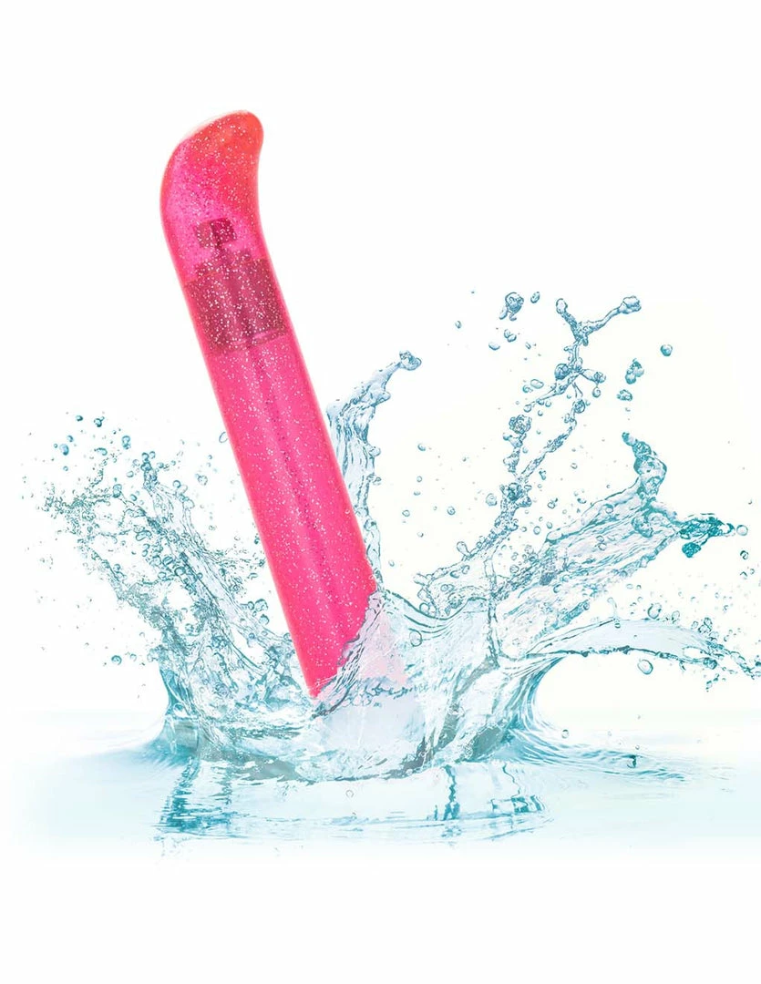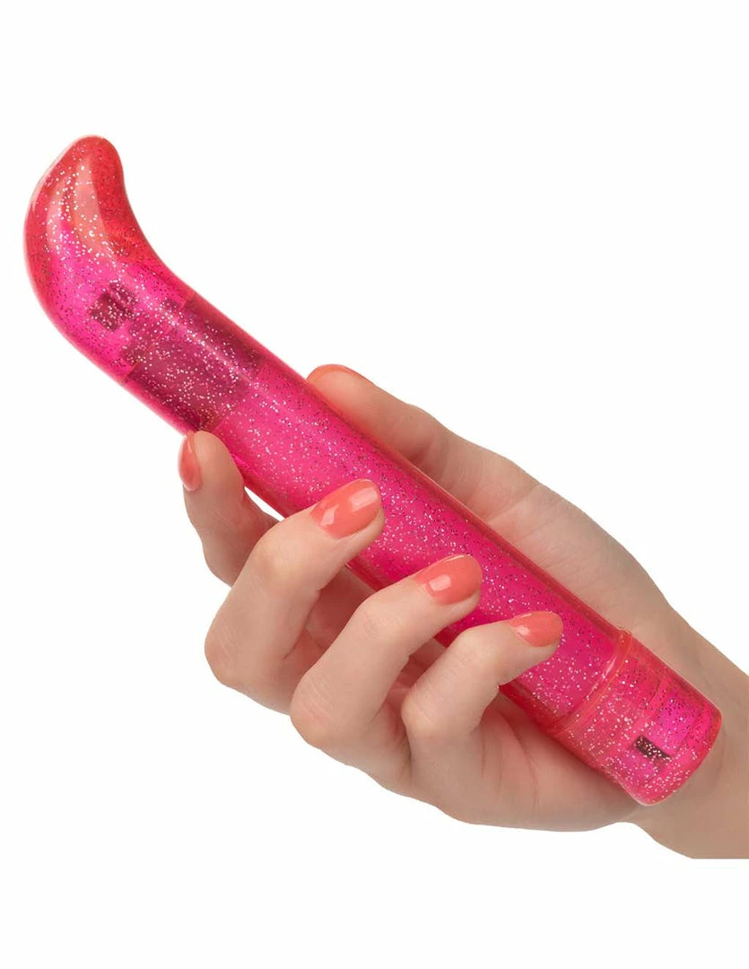 Dazzle in the dark with the Sparkle Slim G-Vibe. This sleek vibrating toy is ideal for beginners or plays a sparkling addition to your toy collection. It features 3 powerful vibrating speeds that are easy to use with a simple one step button. Stimulate your g spot alone or with a partner as the curved tip is designed to penetrate effortlessly. The ABS material is infused with a decorative glitter that sparkles in the light. It also remains to be waterproof and comfortable to touch. Two AA batteries simple power this vibe as the chamber can be located from the twist off bottom. Let your night shine a bit brighter with the Sparkle Slim G-Vibe.