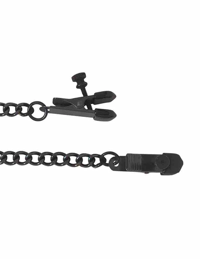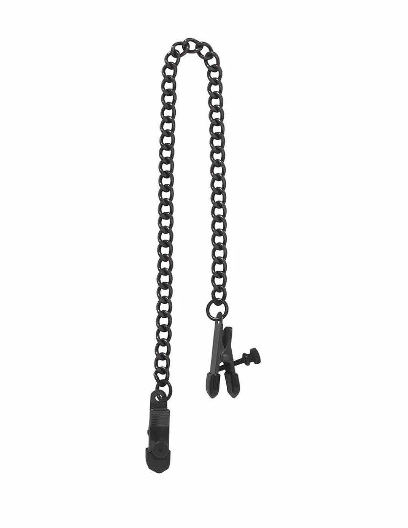 Adjust the clamps and clip them on. The chain can be tugged on for added nipple sensation.