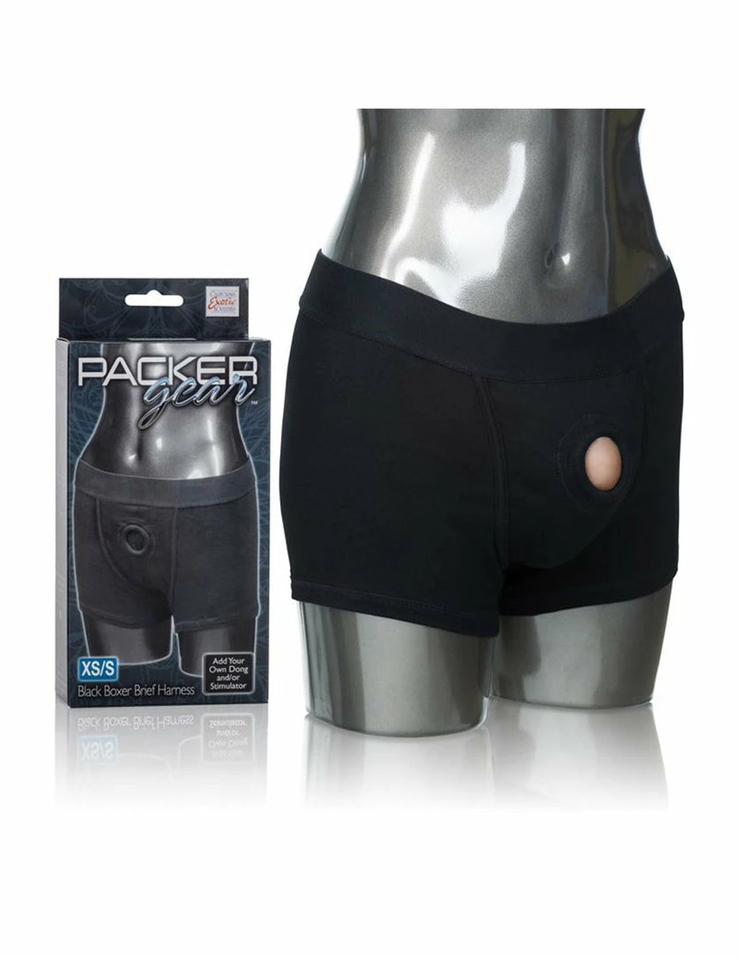 Wear your favorite packing penis with this Boxer Brief Harness by Packer Gear. This boxer brief harness gives full coverage and feels comfortable to wear. It allows you to wear your packing penis in or out of the boxer briefs. It is made of soft and stretchy cotton material. Its elastic band sits securely on or over your hips. It has a built in universal O-ring designed to fit most dildos or penis packers. Designed with internal pockets, you can also store a vibrating bullet within this harness for added stimulation. This harness is great for beginner or experienced individuals.