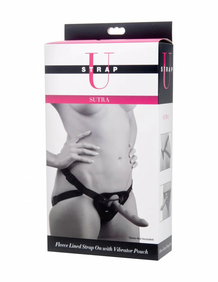 Sutra by Strap U is a fleece lined harness with bullet pocket. This harness is fully adjustable, with comfortable straps that wrap around the back of the legs but still allow easy access to the crotch. The front panel is fleece lined and offers comfort while still holding the dildo firmly in place. The waistband and thigh straps are both fully adjustable and can accommodate waists up to 62 inches. You can insert your favorite flared base dildo into the included silicone O-ring, and you are ready to start penetrating your partner. This harness comes with 1 interchangeable ring to accommodate dildos up to 1.75 inches in diameter. O-rings snap into place so feel free to use your own for even more size options!