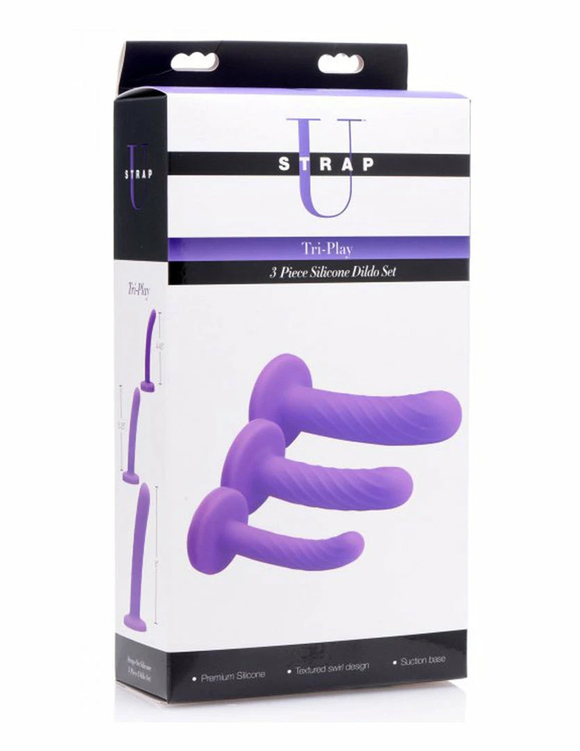 Get 3 multi-sized dildos for the price of 1. Tri-Play by Strap U includes a 5 inch, 5.75 inch, and 7 inch dildo. They are 0.8 inches, 1.15 inches, and 1.5 inches wide. These dildos are smooth with a spiral ribbed texture. They are made of silicone material. Their curved design was made for prostate or G-spot stimulation.