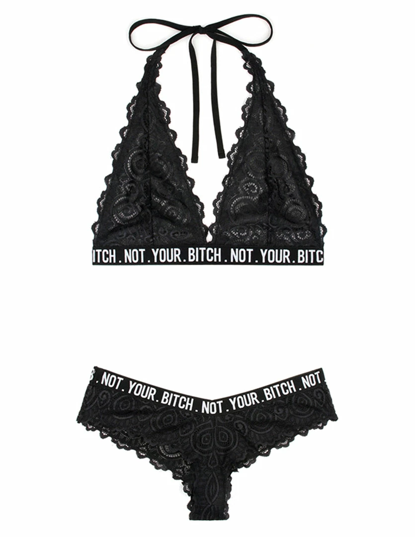 This set comes with a halter bralette. It is made of lace with scalloped lace lining. The band is thick with “Not Your Bitch” in bold white font surrounding it. It comes with a matching cheeky panty. The halter and back straps are adjustable. The lace material is light and stretches. This is a great set to wear under a halter top outfit. It can also be worn in the bedroom to flaunt your curves.
