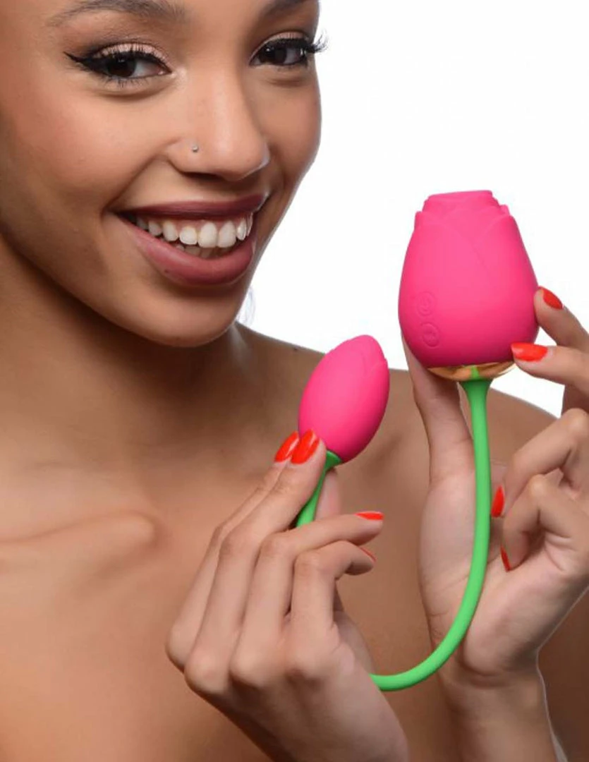 You’ve definitely rose to the occasion when you stumbled on the Bloomgasm Rose Duet. This double sided sprouts with a familiar bulb that sucks and pulses for external pleasure, the smaller side can be inserted for a deeply satisfying vibration. The cord marries both ends making it one ultimate toy. There are 3 speeds and 7 patterns of vibrations along with its 5 sucking patterns. The overall length is 14.5 inches with the cord being 9.5 inches. The suction rose measures with 2.2 inches in length and width of 2.8 inches. The smaller insertable rose measures with 2 inches in length with a width of 1.25 inches. It is made up of a waterproof velvety premium silicone with an ABS plastic. Never run out of fun with the USB charging cable. Petal into you pus’ with the Bloomgasm Rose Duet.