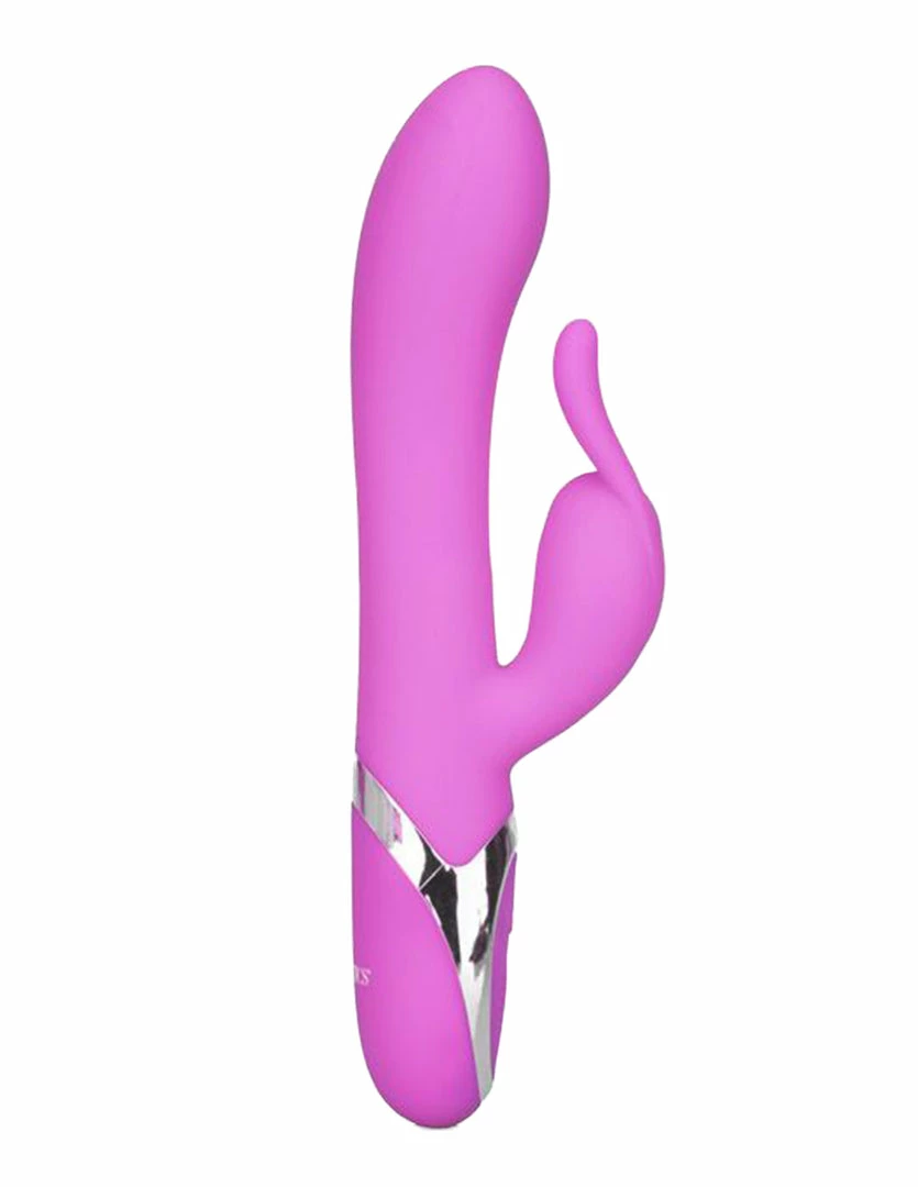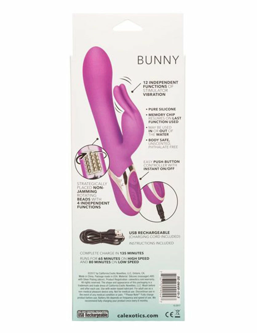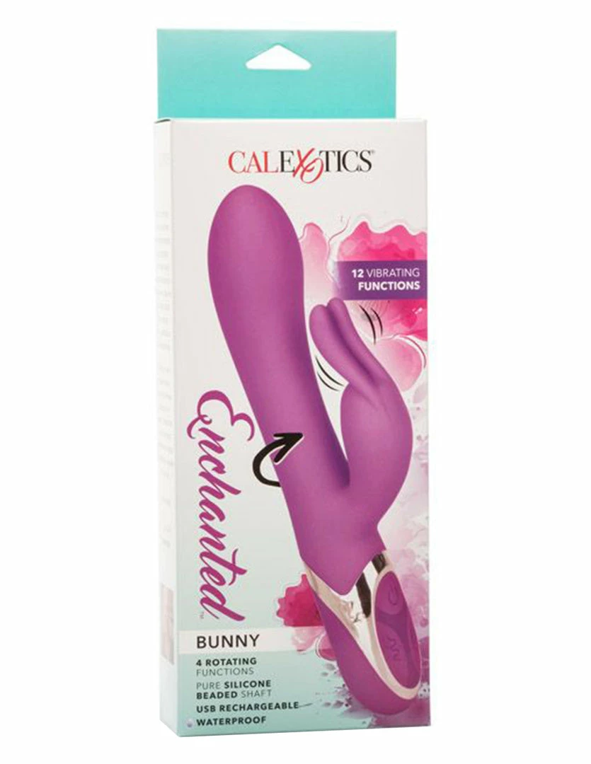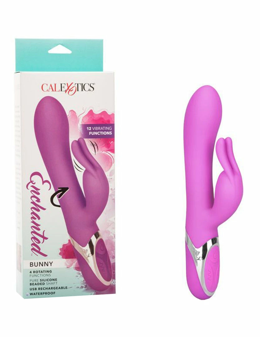 The Enchanted Bunny by CalExotics is a dual stimulating vibrator. It is made of smooth quality silicone material. It is USB rechargeable and waterproof. This bunny has 5.25 inches of insertable length with a width size of 1.5 inches. Its curved head fills the vaginal opening and allows it to relax around its slim neck. The bunny ears feel like 2 smooth fingers that stimulate the labia and clitoris. This vibrator has rotating beads built within its shaft. Play with 4 rotating functions and 12 exhilarating vibration patterns. Use plenty of water based lubricant with this toy. It is great for beginners to advanced users.